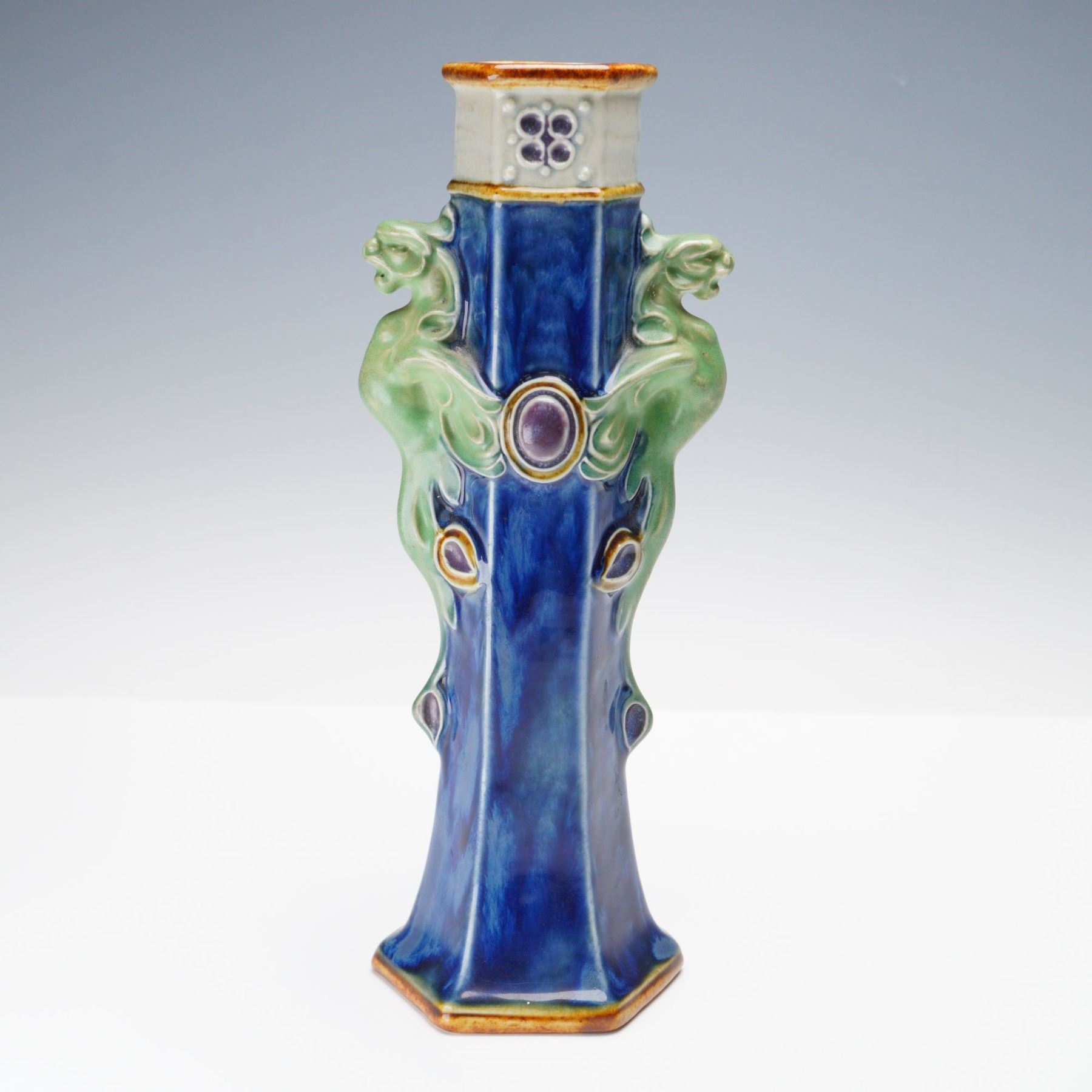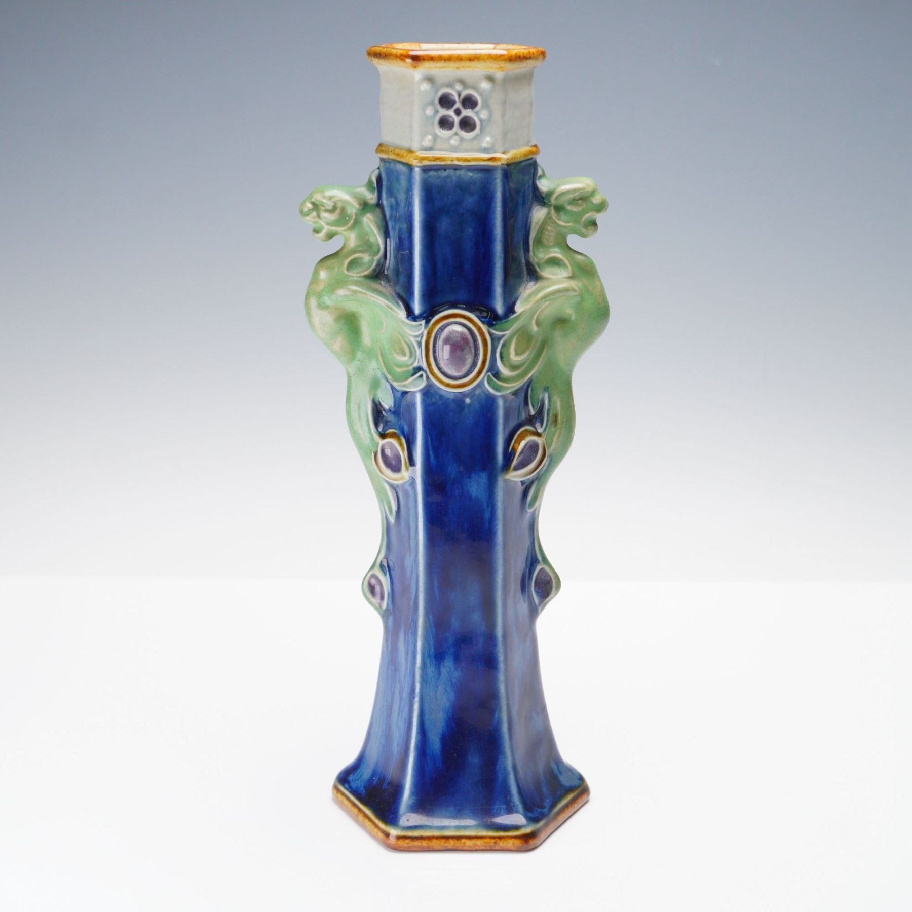 A hexagonal stoneware sleeve vase of tall tapering form, designed with applied grotesque gargoyle handles on either side in a green hue. Finished in a dramatic cobalt blue tone. F. C. P. incised to underside. 7859 impressed to base. Royal Doulton Lambeth impressed to underside.