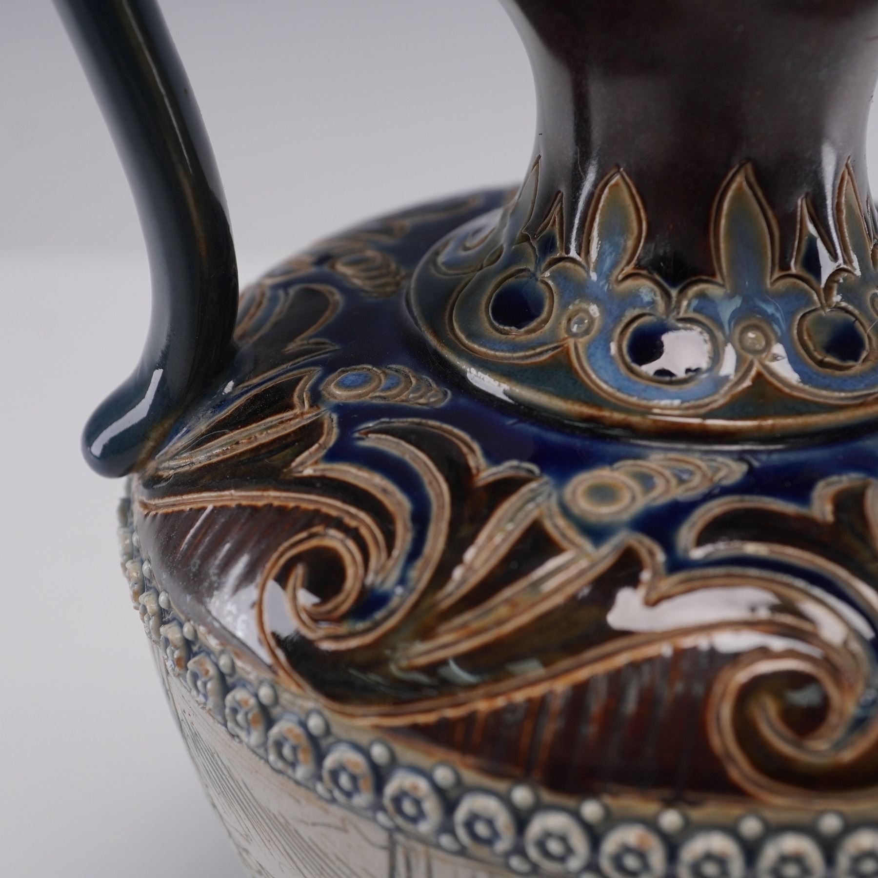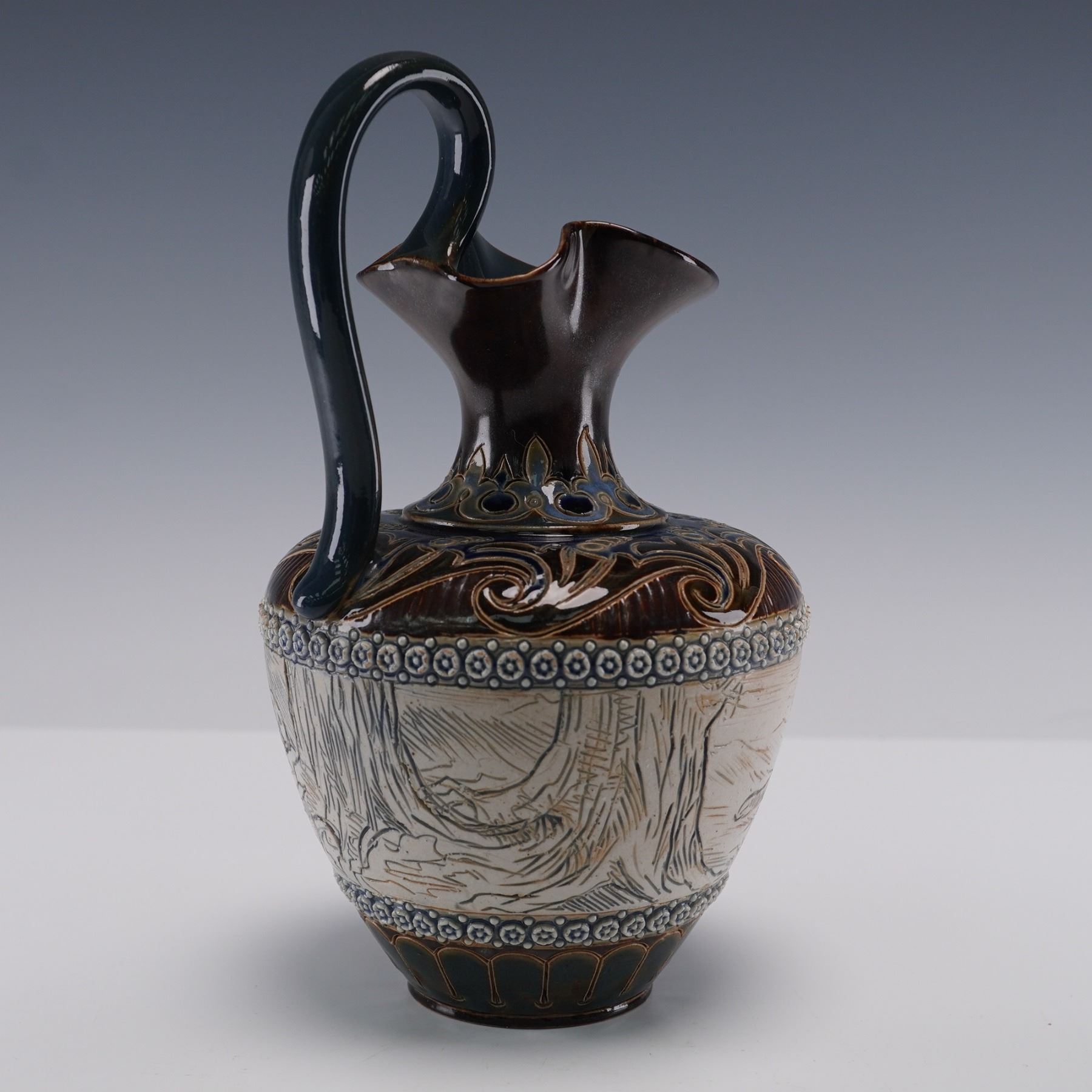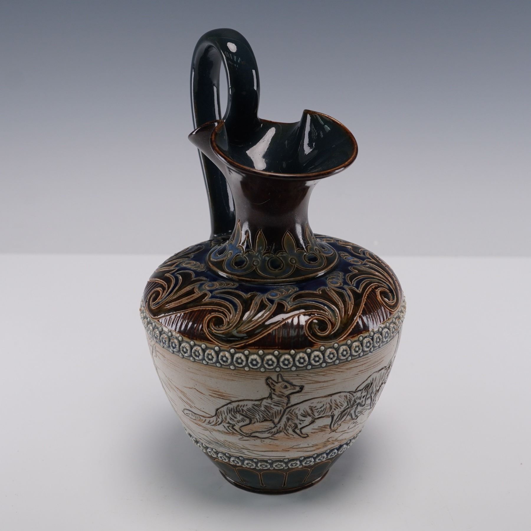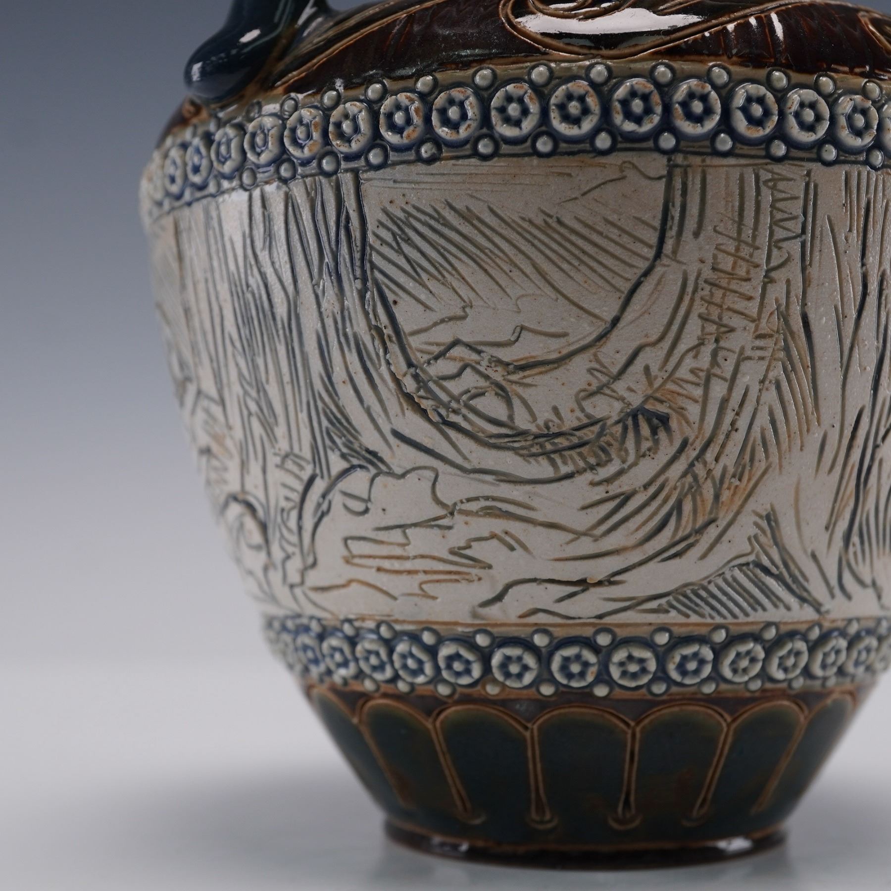 Stoneware pitcher produced by Doulton Lambeth and decorated by artist Hannah Barlow. This piece features a hand-incised continuous hunting scene depicting three foxes pursuing two rabbits through a wooded landscape. Above and below the central illustration are bands of applied rosette borders in relief with blue glaze accents. The upper portion of the pitcher is decorated with scrolling foliate motifs in brown, ochre, and cobalt blue, highlighting the intricate craftsmanship typical of Lambeth studio work. The flared spout and tall, curved handle are glazed in a glossy deep brown. Marked with the "Doulton Lambeth England" impressed stamp. Artist's initials are feature on the underside.