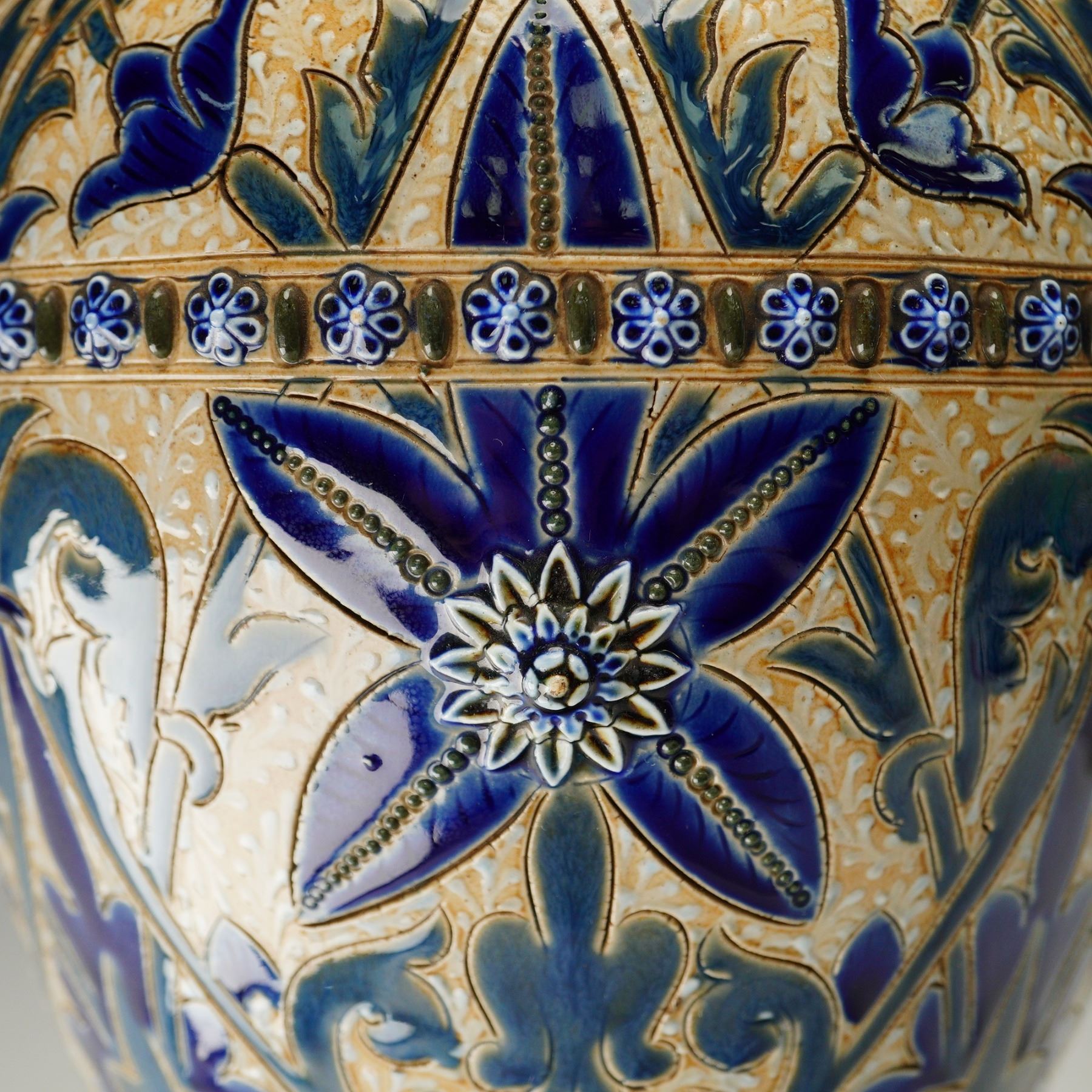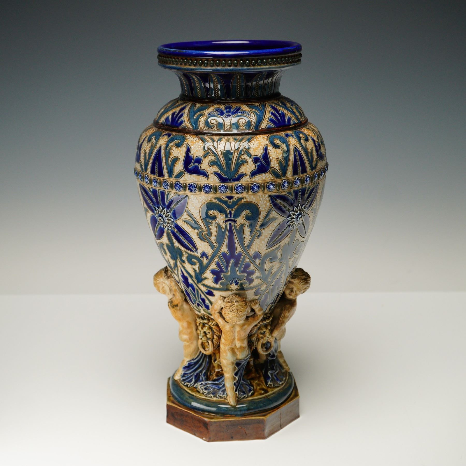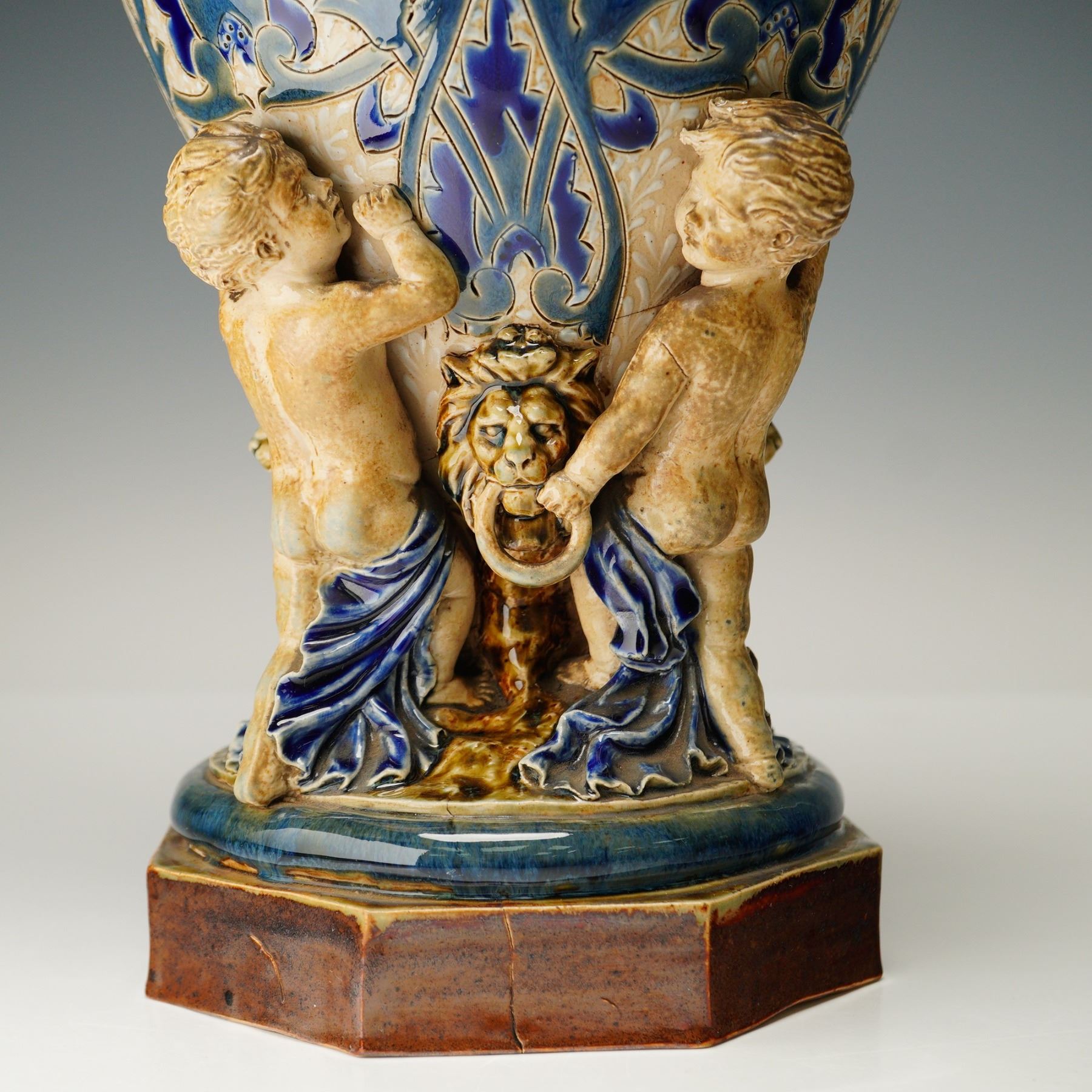 The vase features incised and glazed floral motifs in the Art Nouveau style, executed in cobalt blue, green, and cream. A central band of applied rosette medallions is set among stylized foliage decoration. Four sculpted putti are arranged around the base, each flanking a lion-head mask with a ring clasped in its mouth, forming integral handles. The piece rests on an octagonal foot with a glazed finish. The underside is impressed with the Doulton Lambeth mark, the year, and the artist's monogram.