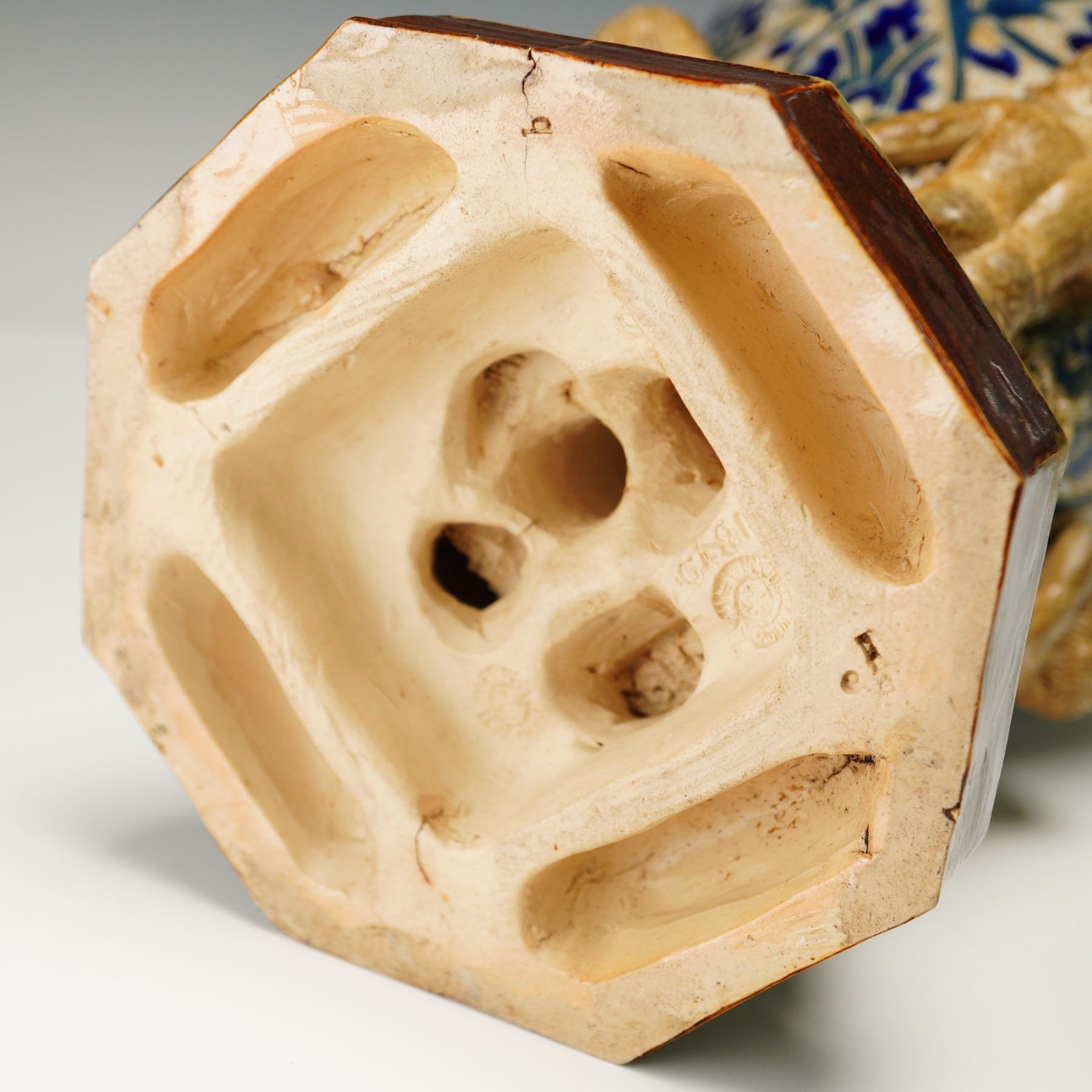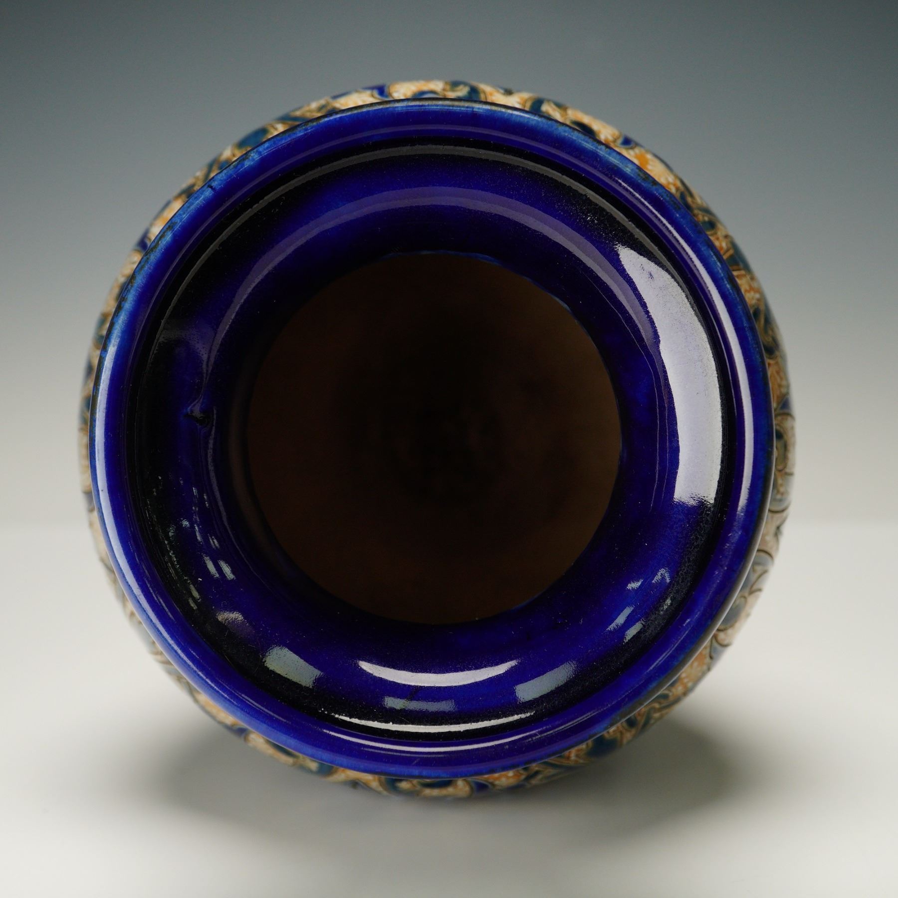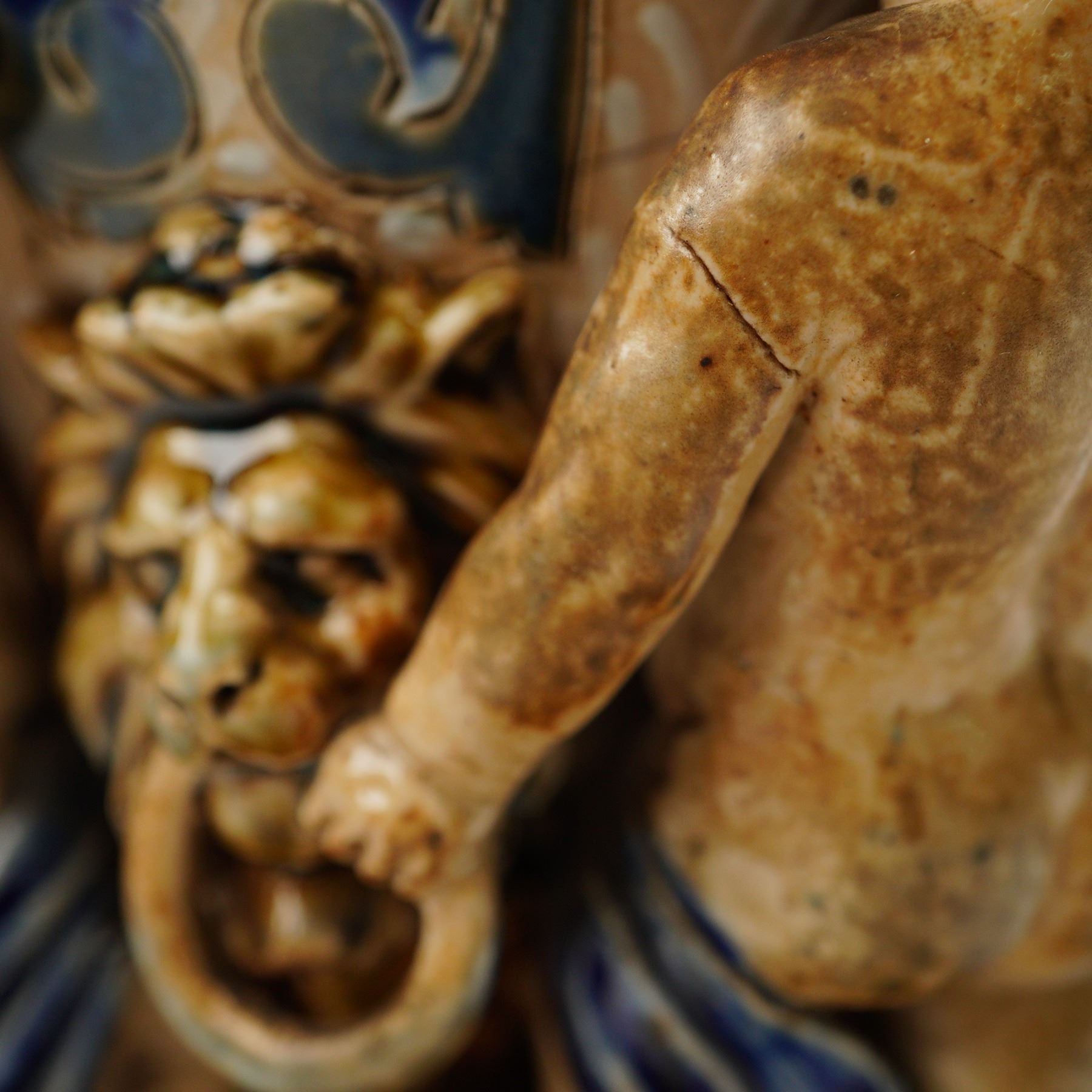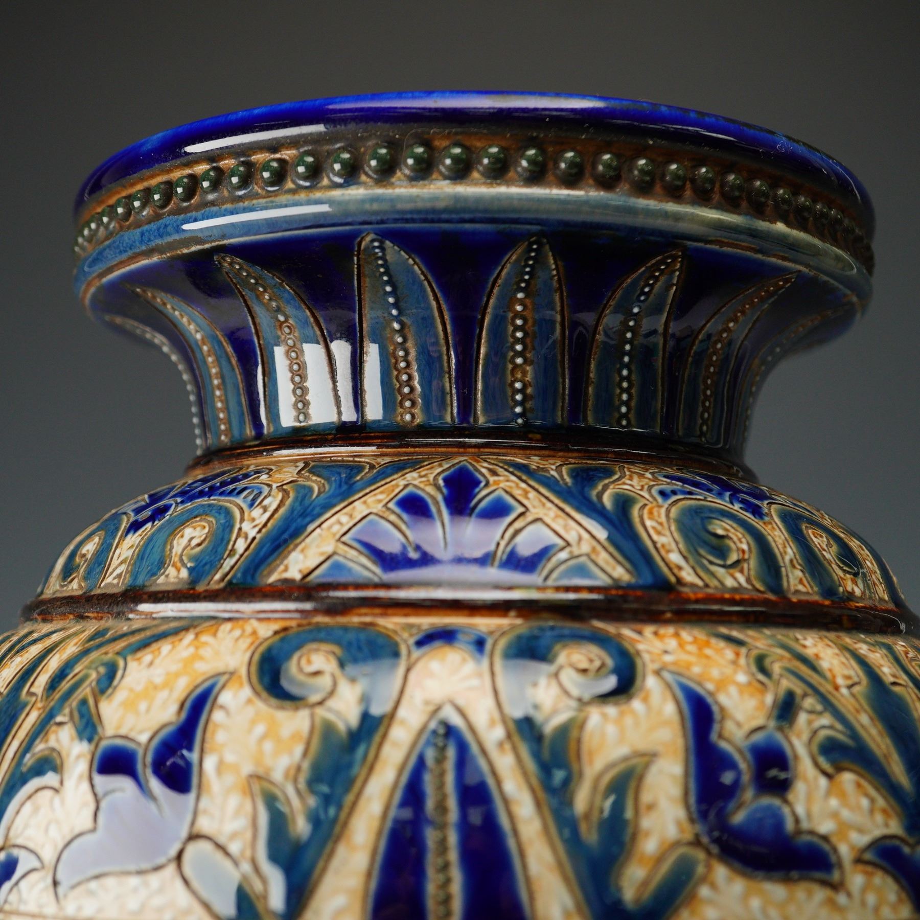The vase features incised and glazed floral motifs in the Art Nouveau style, executed in cobalt blue, green, and cream. A central band of applied rosette medallions is set among stylized foliage decoration. Four sculpted putti are arranged around the base, each flanking a lion-head mask with a ring clasped in its mouth, forming integral handles. The piece rests on an octagonal foot with a glazed finish. The underside is impressed with the Doulton Lambeth mark, the year, and the artist's monogram.