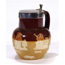 Doulton Lambeth stoneware jug with silver plated mount and applied hunting scenes, impressed marks to base, 16cm high