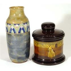 Doulton Lambeth stoneware vase and a Doulton tobacco jar hand painted with Dutch scenes onto a brown ground, largest 25cm high