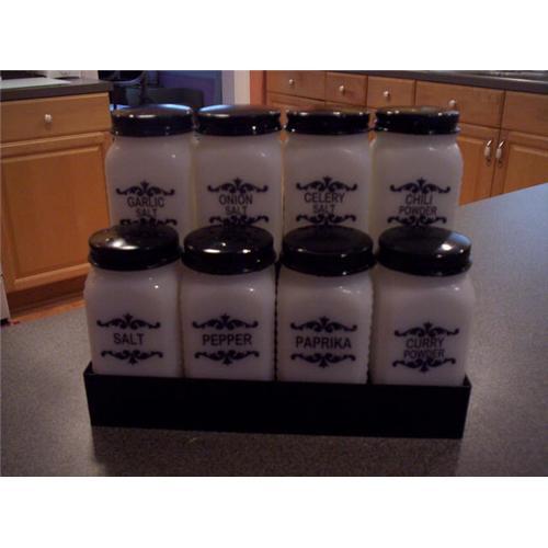 <table width="100%" border="0" cellspacing="0" cellpadding="4"><tr><td><em> </em></td></tr><tr> <td width="100%"> This is an old spice set that has been refurbished with paint and new labels. The jars, tops, inserts and rack are all original. The tops and rack have been repainted with a good job being done. The decals are new but a very close reproduction of the old Dove labels. All of the jars have inserts except for the salt and pepper. The rack can be hung on a wall or can sit on a counter. No chips or cracks are noted. In this set you have a salt, pepper, paprika, curry powder, chili powder, onion salt, celery salt and garlic salt. If you're not a purist and like the look of old, then this might be right up your alley.