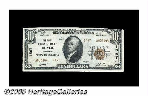 <B>Dover, DE</B></I> - $10 1929 Ty. 2 <B>The First NB</B></I> Ch. # 1567<BR>A bright <B>About Uncirculated</B></I> example with the top margin trimmed in very slightly at the far right.