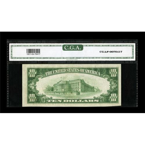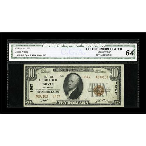 <B>Dover, DE</B></I> - $10 1929 Ty. 2 <B>The First NB</B></I> Ch. # 1567<BR> Delaware is a scarcer state for Nationals as a whole. A tiny signature of E.P. Horsey and John Carrow adorn this state capital note. <B>CGA Choice Uncirculated 64.</B></I><BR><BR><b>Shipping:</b> Coins & Currency (<a target="_blank" href="http://www.heritageauctions.com/common/shipping.php">view shipping information</a>)