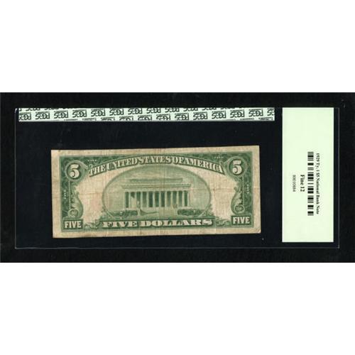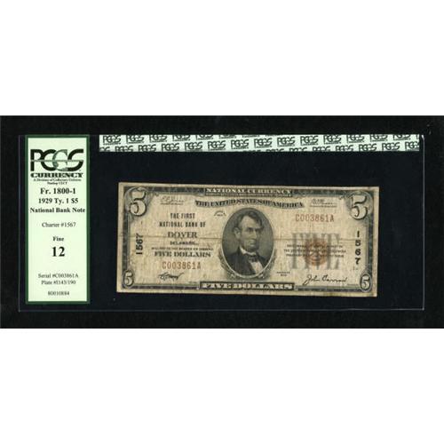 <B>Dover, DE</B></I> - $5 1929 Ty. 1 <B>The First NB</B></I> Ch. # 1567<BR> A pleasing state capital example graded <B>PCGS Fine 12</B></I>.<BR><BR><b>Shipping:</b> Coins & Currency (<a target="_blank" href="http://www.heritageauctions.com/common/shipping.php">view shipping information</a>)