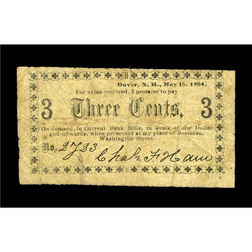 <B>Dover, NH- Chas. F. Ham</B></I> 3¢ May 15, 1864<BR>One of the scarcer New Hampshire 3¢ notes from this collection, with this an issuer we've not seen previously. <B>Fine</B></I> or better, with one insignificant repair.