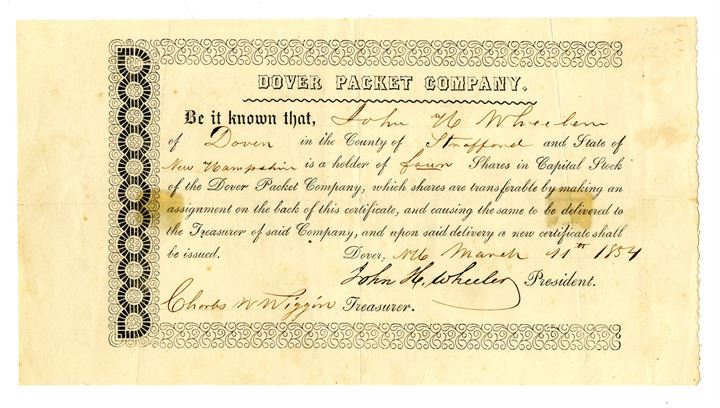 Dover, New Hampshire. 4 Shares I/U Stock Certificate, Black print on black border on small sized certificate, Company title at top, Fine-VF condition with mounting stains at left and right side. Rare early shipping company.