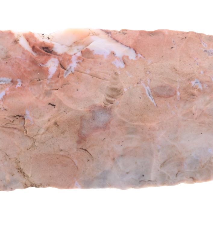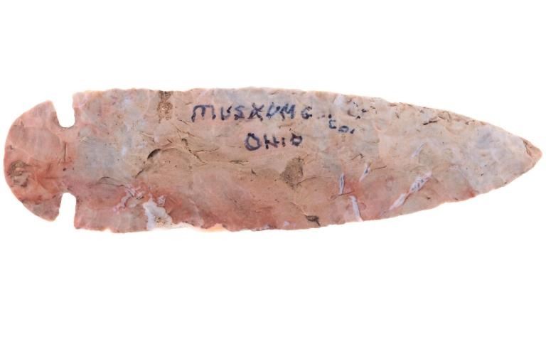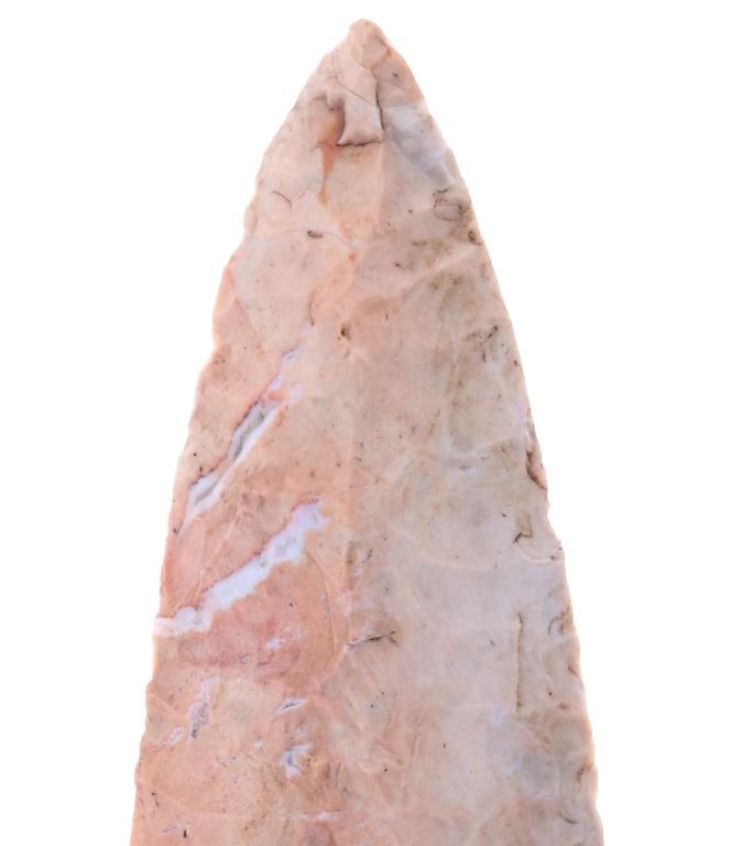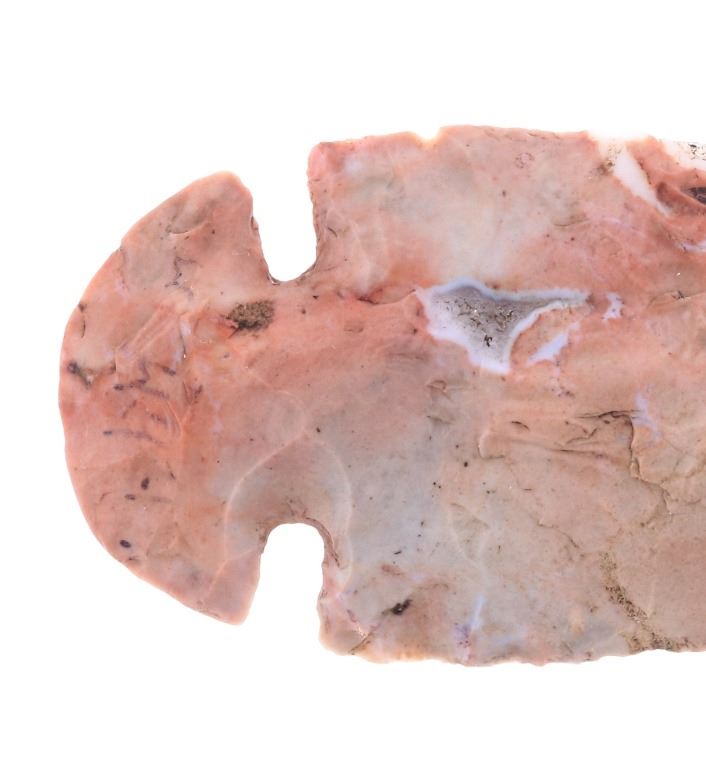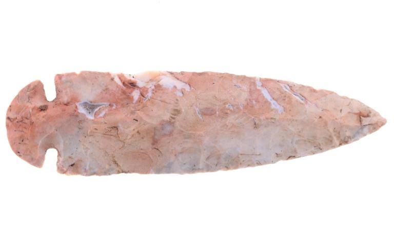 Featured in this lot is this original dovetail St. Charles point from the Early Archaic Period and aged from B.P. 10,000 - 8,000. The point shows a medium corner notched point with an elliptical cross section. The blade shows an excurvate example with a serrated blade. The shoulders are barbed and feature an expanding stem. The point was knapped from a red and cream chert material. The condition of this point is good, with no obvious signs of damage. The measurements of this point are 4 3/8" x 1 1/4" x 1/4".
