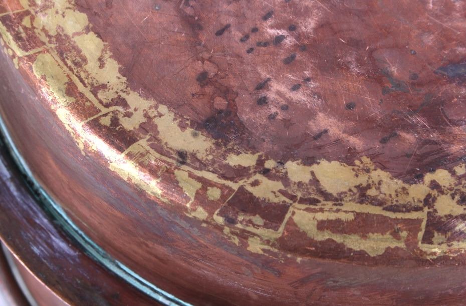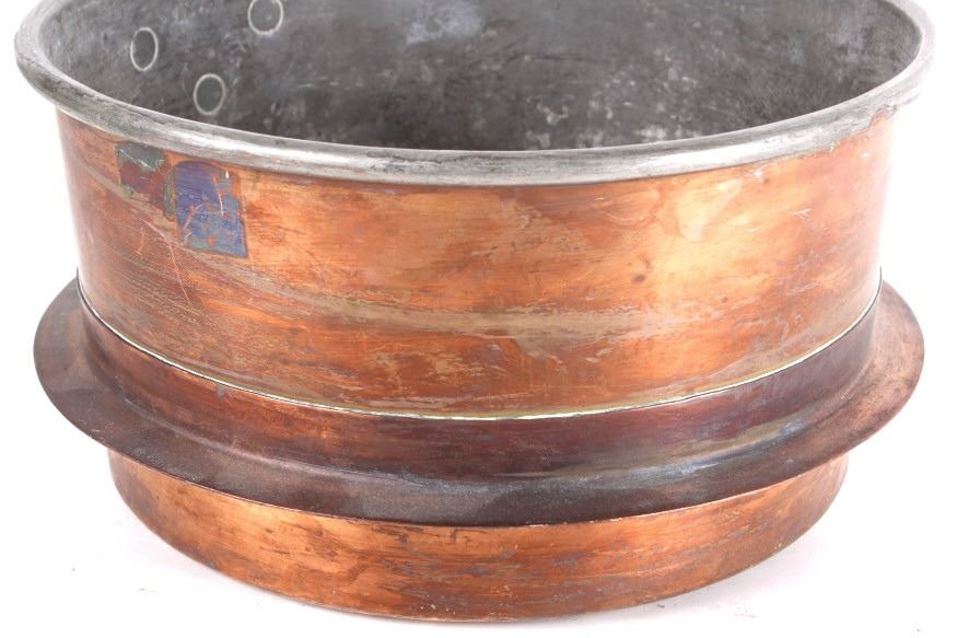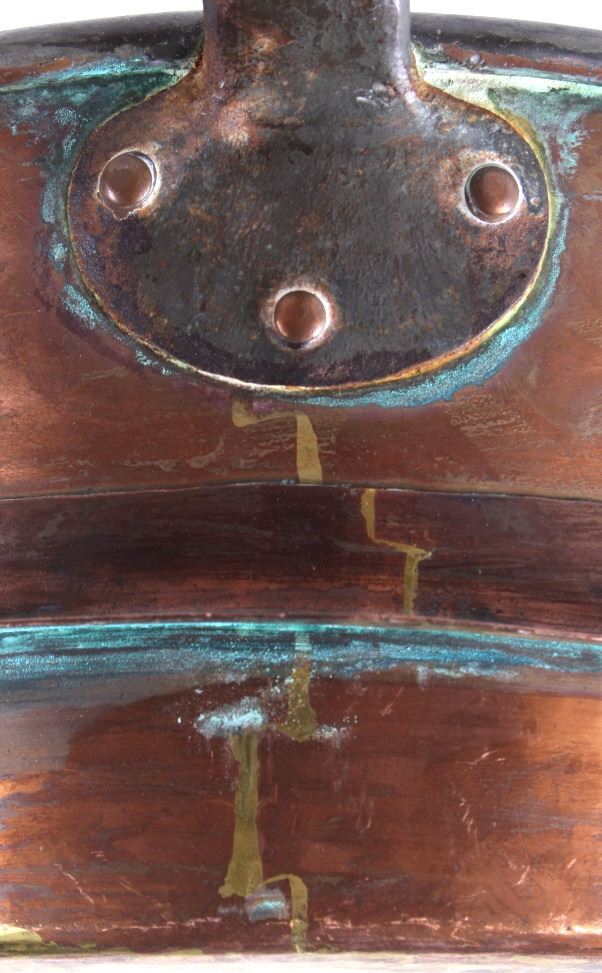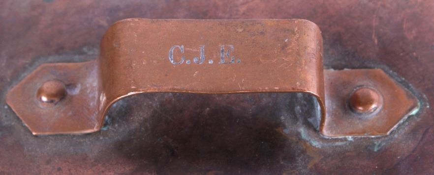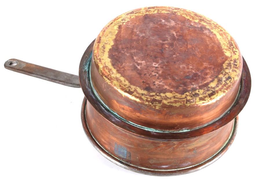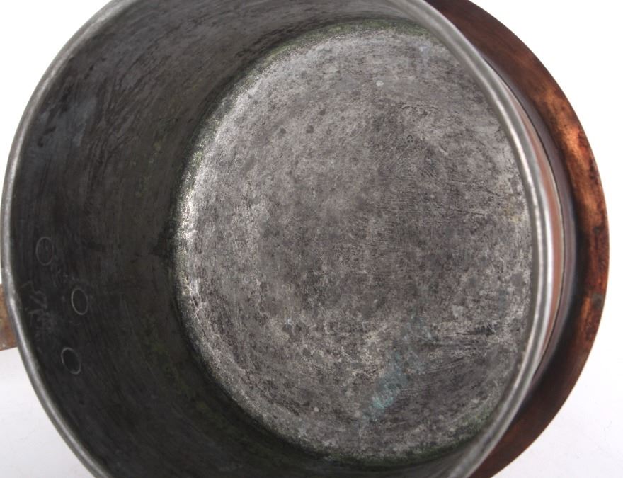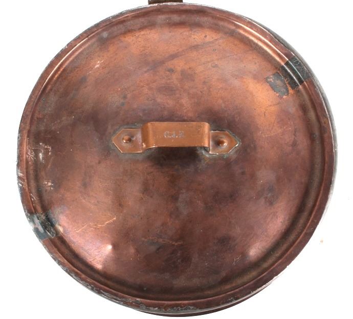 This lot features a dovetailed copper saucepan with iron handle with lid. This is a unique piece of cookware has a skirt to allow hotter cooking on a wood stove. The piece is marked C.J.E. on the lid handle. The piece is in good condition for its age. It measures 8 1/2" D x 15" L x 4 7/8" H