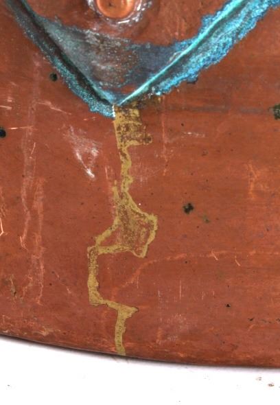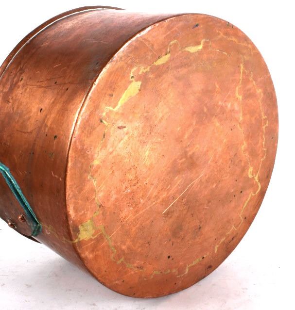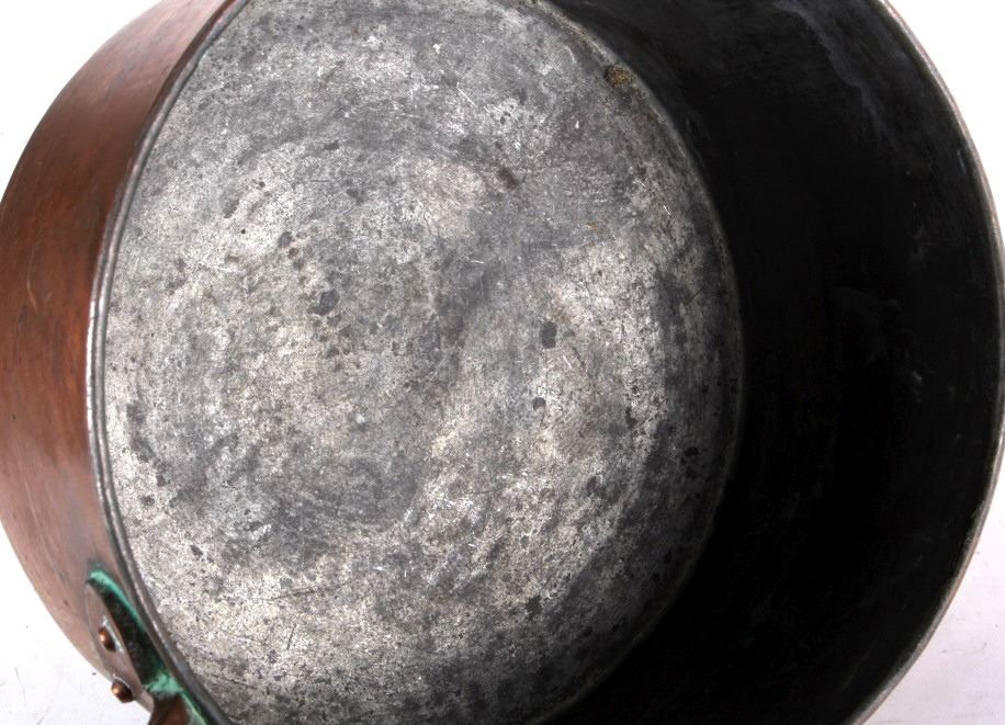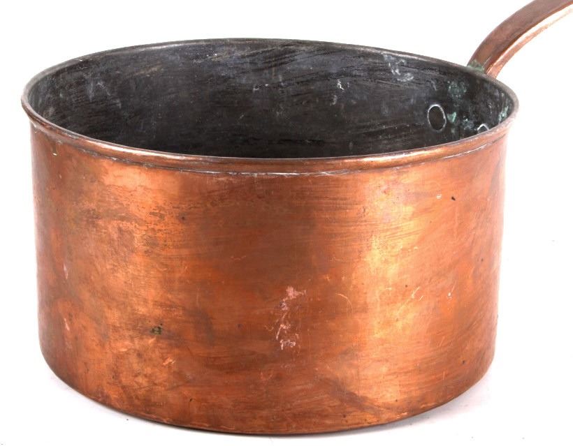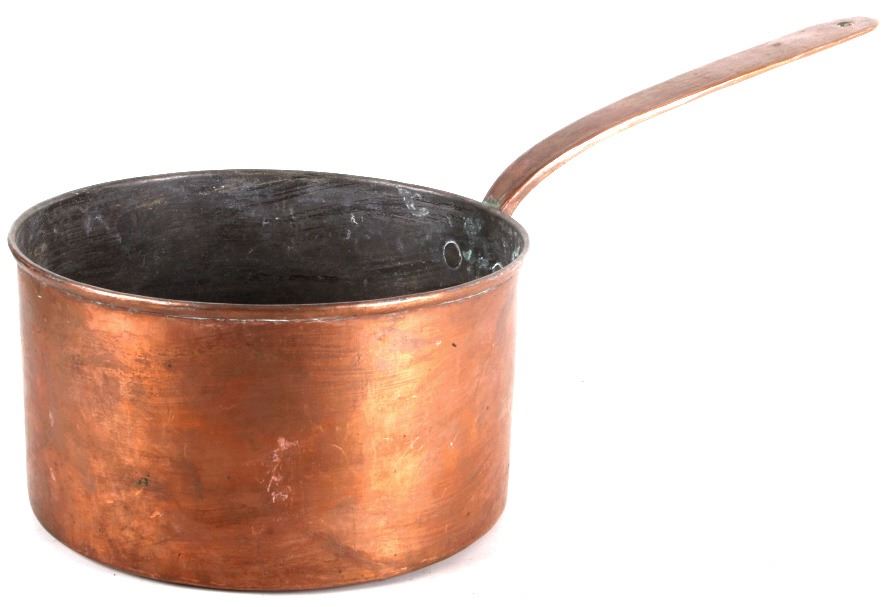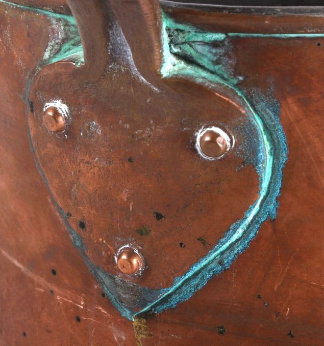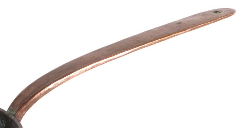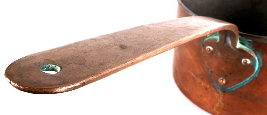 This lot features a beautiful dovetailed copper saucepan with hand hammered heart handle. This piece is a wonderfully crafted example of functional art. This piece shows a hand hammered heart handle and dovetailed construction that shows great quality and condition. The piece shows great patina and little wear. It measures 21" L x 10 1/8" D x 9" H