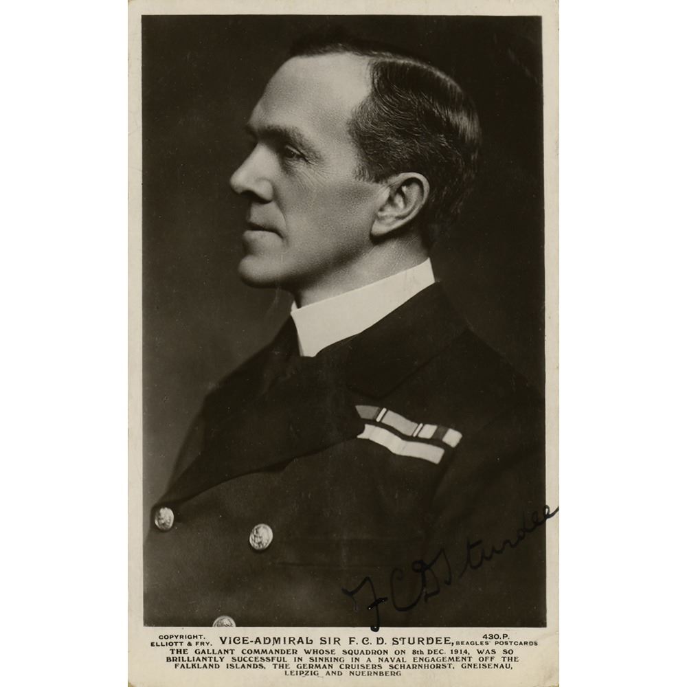 Royal Navy officer (1859–1925) celebrated for his success against the Imperial German Navy at the Battle of the Falkland Islands during World War I. Vintage glossy 3.5 x 5.5 photo of Vice Admiral Sturdee in profile, signed in fountain pen, "F. C. D. Sturdee." In very good to fine condition, with light creasing and scuffing.