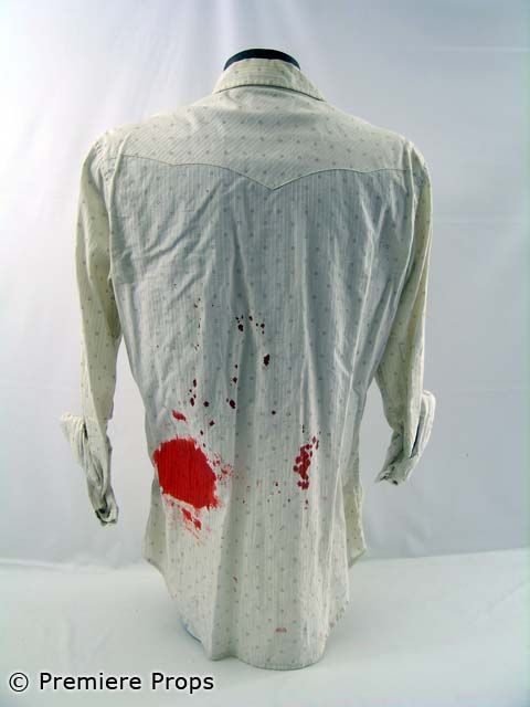 "Down In the Valley" - Harlan's white w/ brown squares "American Eagle" l/s button up bloody shirt (size M/M / blood stains & tears) (screenworn). From Ed Norton's personal collection.