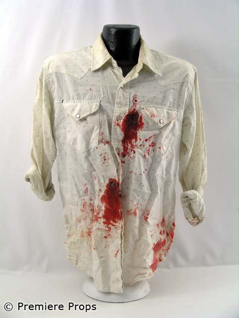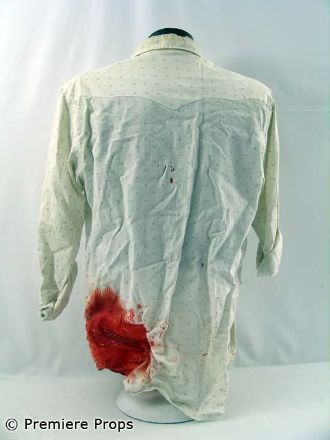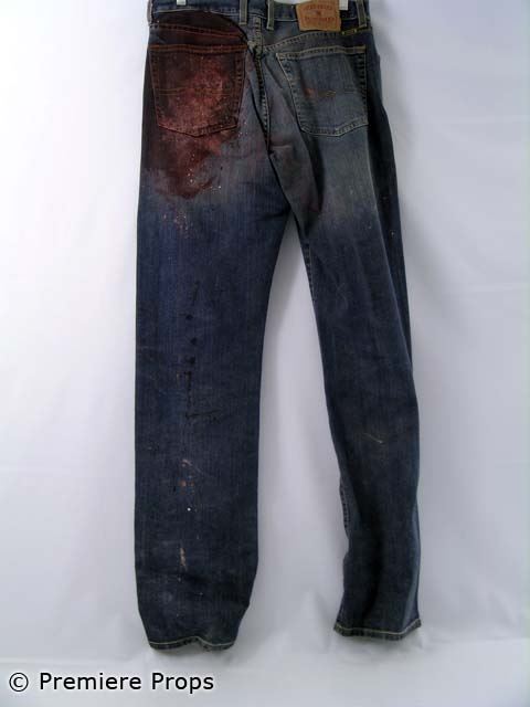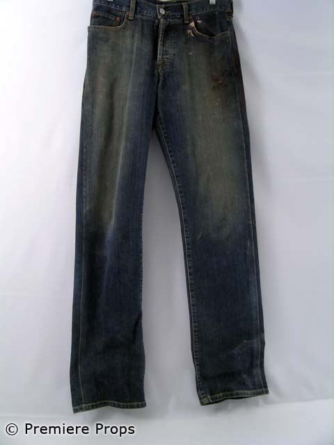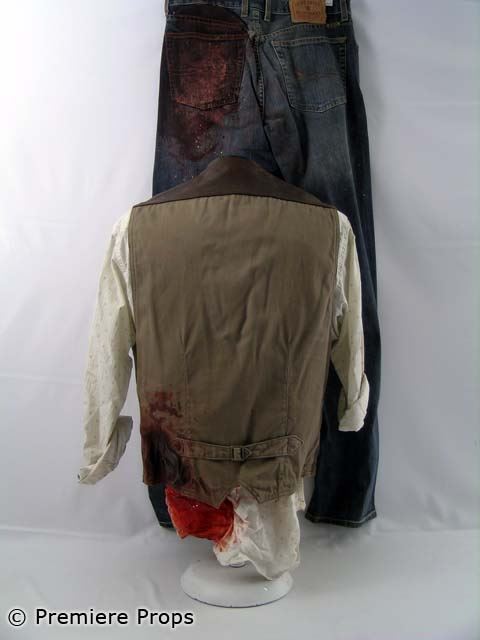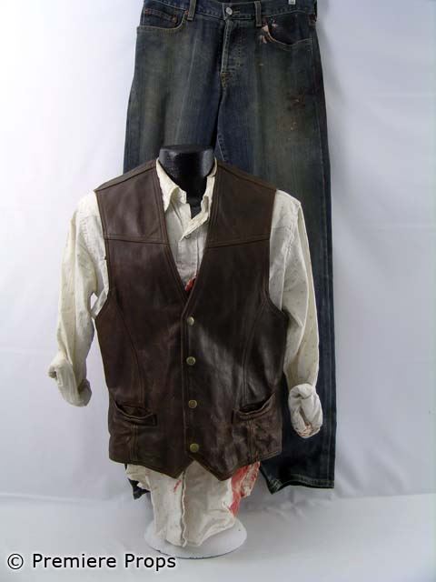 "Down In the Valley" - Harlan's brown leather bloody vest (no size / blood stains), blue denim Lucky Brand" bloody jeans (size 32 / blood stains mostly on back), white w/ brown squares "American Eagle" l/s button up bloody shirt (size M/M / blood stains) (screen worn)