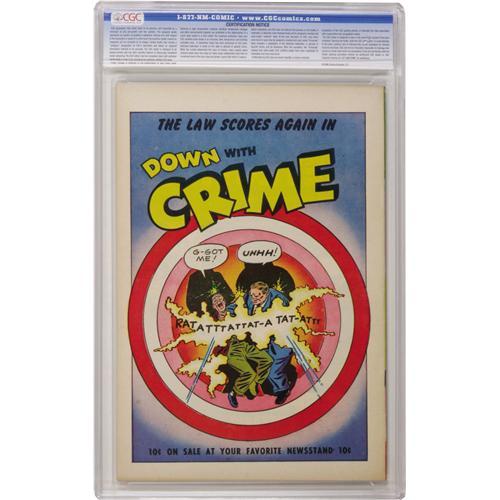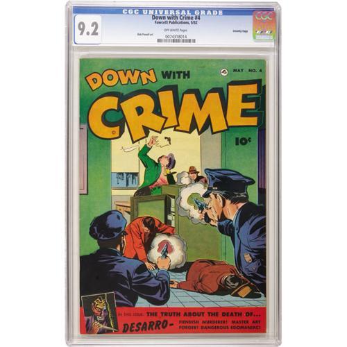 <B>Down with Crime #4 Crowley Copy pedigree (Fawcett, 1952) CGC NM- 9.2 Off-white pages.</B></I> They fought the law and the law won: some safecrackers eat lead on this pre-Code cover (and if that's not enough justice for you, some other crooks get perforated by Tommy guns on the back cover). The issue has interior art by Bob Powell. Only one other copy, also a Crowley, has graded higher. Overstreet 2006 NM- 9.2 value = $185. CGC census 10/06: 1 in 9.2, 1 higher.<BR><BR><b>Shipping:</b> Slabbed Comic (<a target="_blank" href="http://www.heritageauctions.com/common/shipping.php">view shipping information</a>)