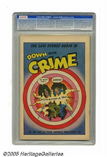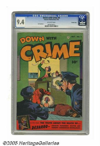 <B>Down with Crime #4 Crowley pedigree (Fawcett, 1952) CGC NM 9.4 Off-white pages.</B></I> They fought the law and the law won: some safecrackers eat lead on this pre-Code cover (and if that's not enough justice for you, some other crooks get perforated by Tommy guns on the back cover). The issue has interior art by Bob Powell. This is the highest-graded copy of this issue that CGC has certified to date. Overstreet 2005 NM- 9.2 value = $180. CGC census 3/05: 1 in 9.4, none higher.