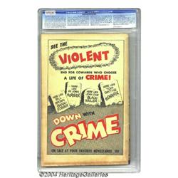 <B>Down with Crime #7 Quadruple Cover (Fawcett, 1952) CGC VF 8.0 Off-white pages.</B></I> Yes, we really mean it; this comic has a <I>quadruple</B></I> cover, the first one we've ever had the privilege to offer. Considering that even a double cover is a treasured rarity, our enthusiasm has risen to at least quadruple the usual level. In addition to its one-in-a-million characteristic, the book is an attractive example of the crime comics genre that was regulated out of existence by the Comics Code shortly thereafter. As for the cover itself (by an unidentified artist), the character shown is a dead ringer for DC's Sandman, but this fellow is a criminal with murder on his mind. Yet his intended victim might plug him first, in keeping with the theme of the comic, which advertises "the <I>violent</B></I> end for cowards who choose a life of <I>crime</B></I>!" It was the end for something else, too, as this was the title's last issue. CGC notes, "1st cover 5.0, 2nd cover 7.5, 3rd cover 8.0, interior cover 7.0." Overstreet 2004 VF 8.0 value = $79. <BR><BR><B>Important notice:</B> Heritage usually auctions material at the rate of 200-250 lots per hour. On some occasions eBay Live bid software or the Internet may not be able to keep up with the pace of the auction. We recommend placing a realistic absentee bid now as insurance to avoid disappointment. Occasionally the auctioneer may eliminate or reject an eBay Live bid, and the auctioneer may also reopen a lot after the close of the eBay live bidding (usually because we missed an audience bid), and may reject your bid even if it shows you as the winning bidder. By bidding via eBay Live, you agree that Heritage may award the lot to another bidder at its sole discretion under the circumstances described above or any other reasonable circumstances. Since eBay bids are not shown to us until we open the lot on the floor, we treat those bids just like floor bids. In most cases the floor responds before the eBay bid is presented to us, due to Internet lag time, so for consistency we have made it a policy that floor bids are always considered first over tie eBay live bids. Also please note that all Heritage lots purchased through eBay Live carry a 20% Buyer's Premium. Please make sure you read the Terms and Conditions before you bid.