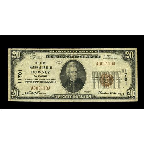 <B>Downey, CA</B></I> - $20 1929 Ty. 1 <B>The First NB</B></I> Ch. # 11701<BR>An evenly circulated example from this Los Angeles County community which bears the first title style used here on Series 1929 examples. The Horwedel collection example, which was just a hair nicer than this, fetched $1610 back in 2004, with a realization in the same area likely for this piece as well. Pleasing <B>Fine.</B></I>