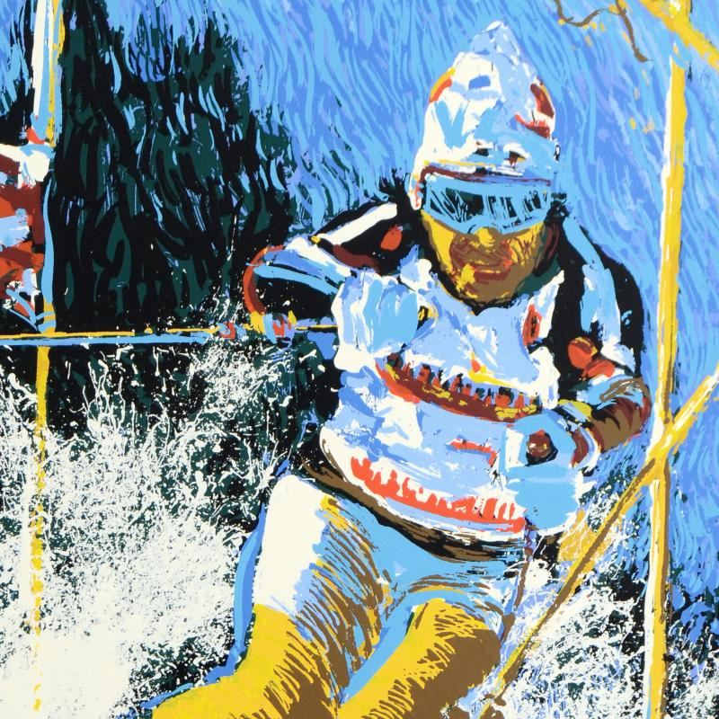 "Downhill Skier" is a limited edition serigraph on deckle-edge paper, hand signed by Paul Blaine Henrie (1932-1999)! Includes Certificate of Authenticity! Measures approx. 26" x 40" (border), 24" x 35.5" (image).