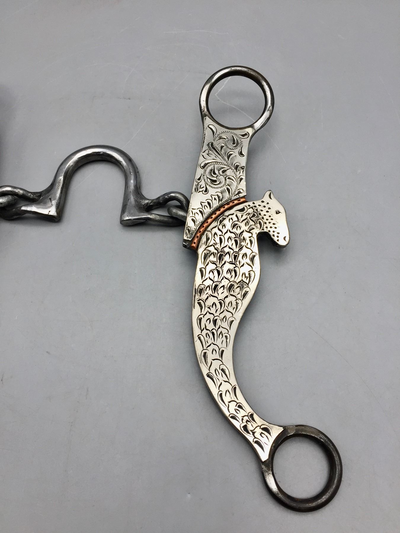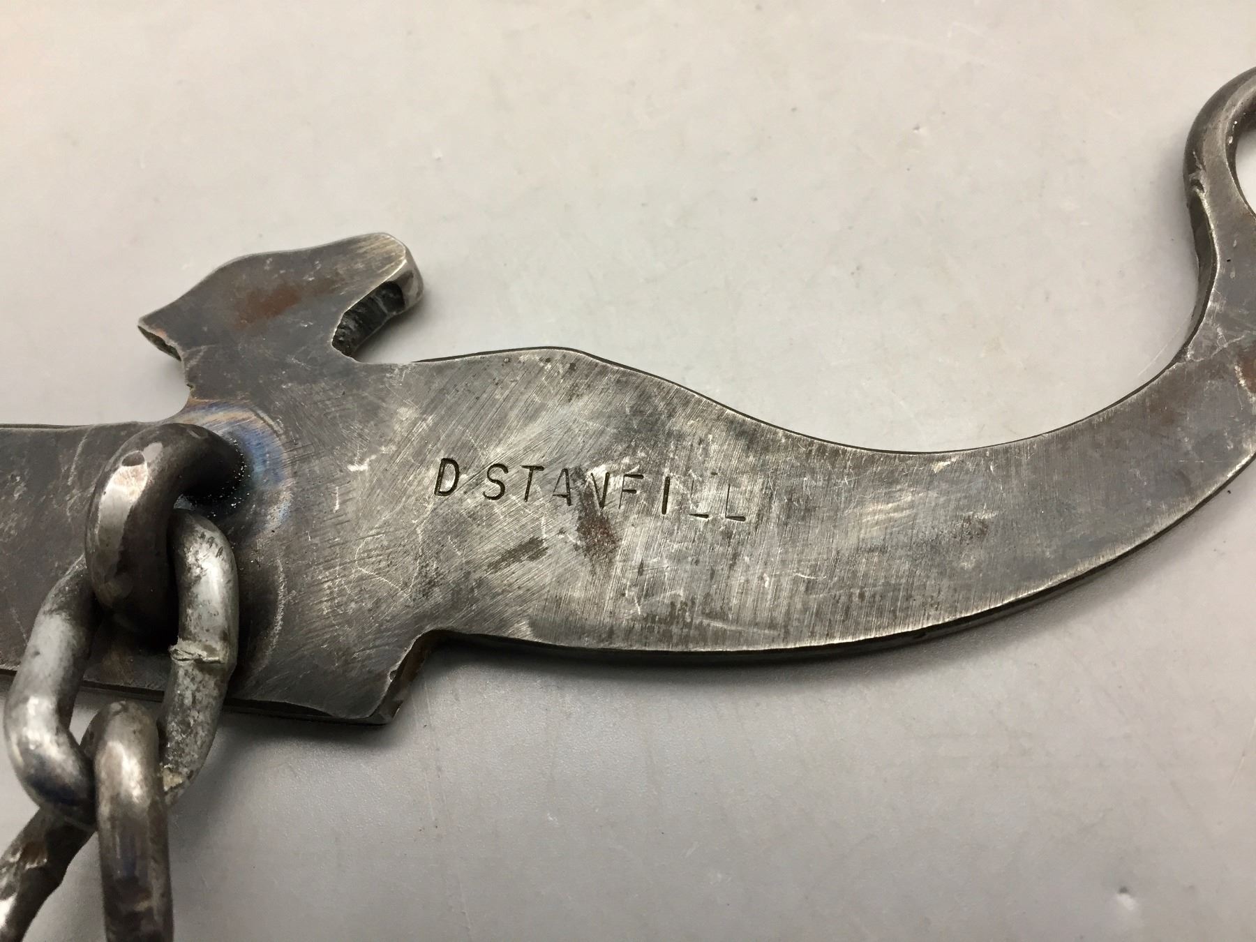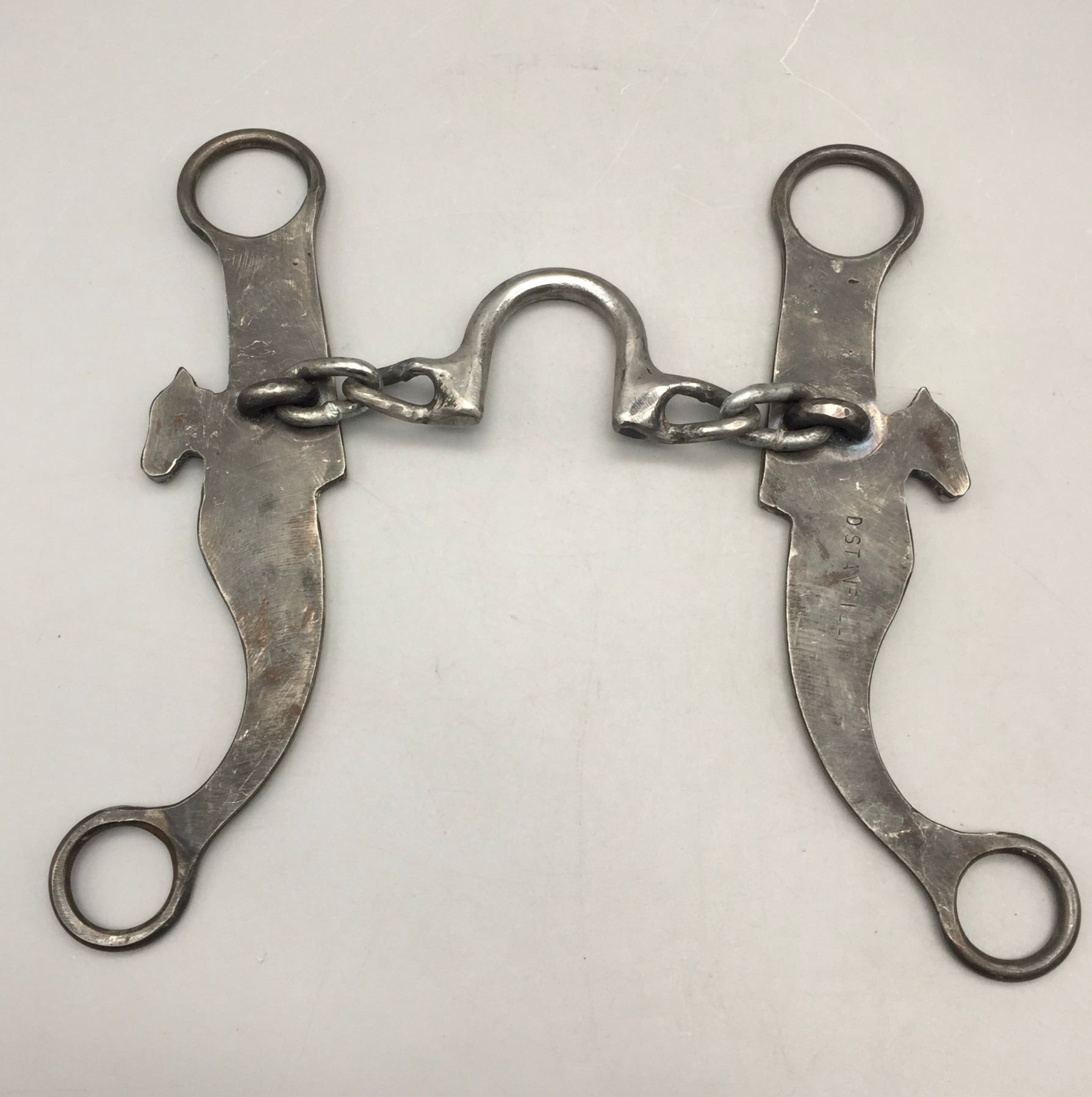 Description: Offered for sale in this lot is a handmade chain bit created by Doyle Stanfill. Maker: Doyle Stanfill. Approx. Age: Modern. Size: 4-1/2” mouth, 8” shank. Condition: Very good. Please look closely at the pictures - they are an important part of our description. Shipping: There will be a $5 handling / packaging fee for shipping this lot. The actual cost of postage will be added on top of that.