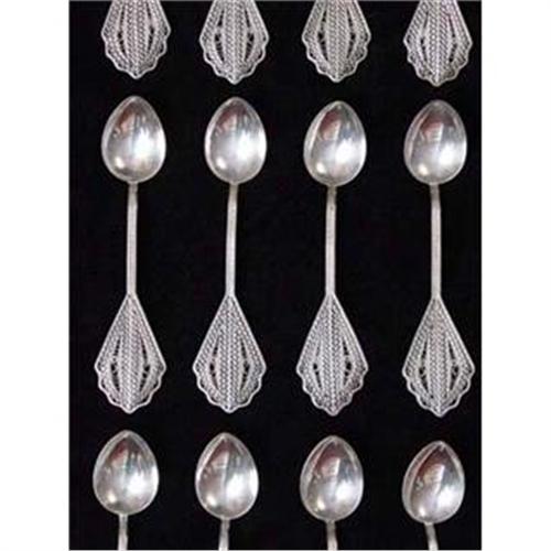 Small coffee spoons with ornate silver filigree handles. They are unmarked but this kind of work was usually done in silver. In good used condition, as shown. Price stated is for set of twelve spoons. Please ask questions, request photos and shipping costs before bidding.