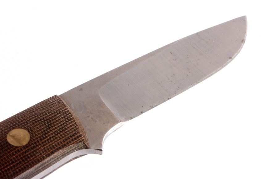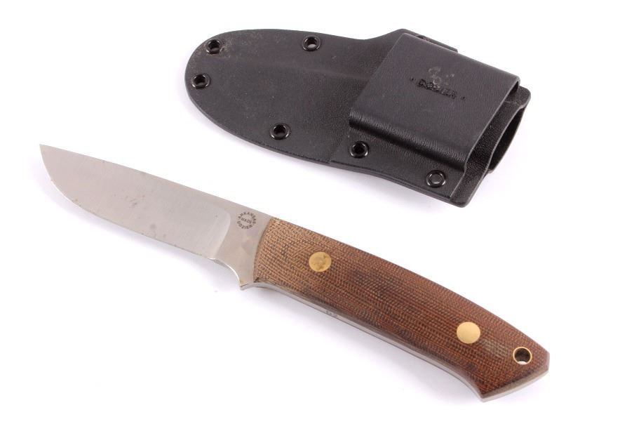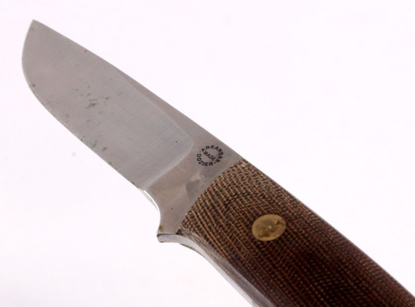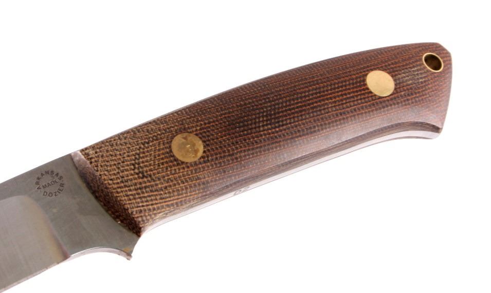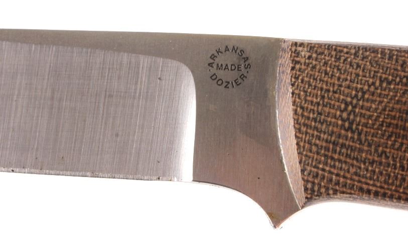 This is a custom fixed blade knife and scabbard made by renowned knife maker Bob Dozier. An iron worker by trade, Dozier spent several years working for A.G. Russell and eventually opened his own shop. This knife features a precision honed blade marked "Arkansas Made Dozier" with a durable micarta blade. The scabbard is custom made as well and is unique to the knife. The Dozier knife is in very good condition. It measures 8" with a 3.25" blade.