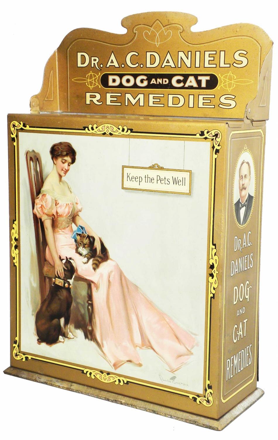 Dr. A. C. Daniels Dog and Cat Remedies Tin Store Display. Beautiful tin litho front with Chase Emerson depiction of Woman with her friends. Dr. Daniels Cameo on both sides. Back provides list of products and prices as will as two doors to access product. One of the best we've ever seen. Some wear to the wood base otherwise near mint condition.