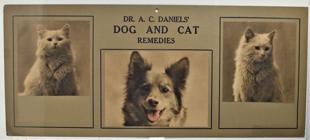Dr. Daniels' Dog and Cat Remedies Cardboard Sign. I wonder if these were blank originally and you could ad your own personal pets to the advertisement. Excellent condition. 21 3/4 X 9 1/2 inches.