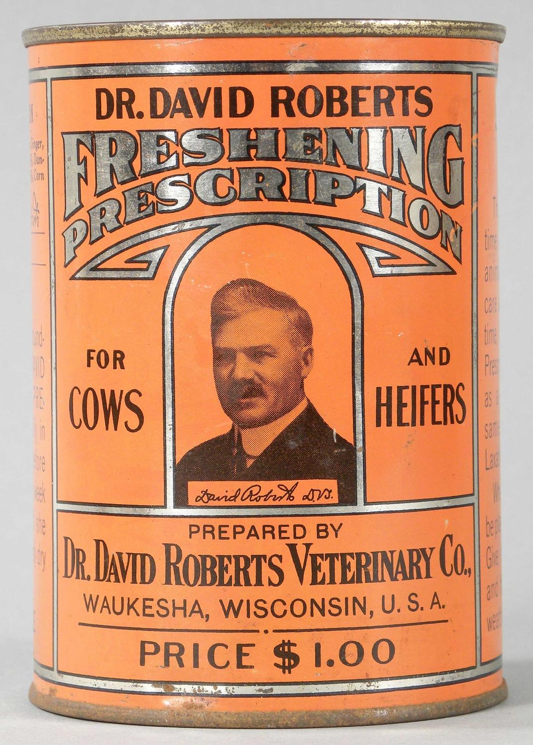 Dr. David Roberts Freshening Prescription for Cows and Heifers. Dr. David Roberts Veterinary Co. Waukesh, WI. USA. Original embossed lid. Slight crease on front otherwise excellent condition. 3 1/2 inch diameter X 4 3/4 inches tall. Start Price $30