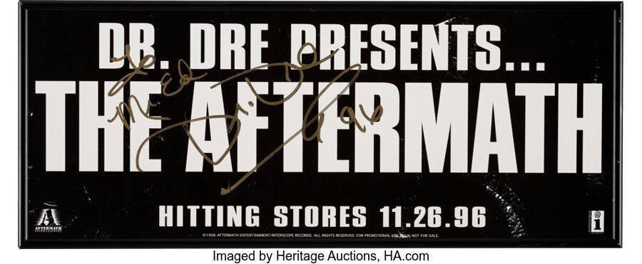 Dr. Dre Signed and InscribedThe AftermathPromo Poster. A framed promo poster for the highly-anticipated project after Dr. Dre split with Death Row Records. Inscribed "To Mr. Ed" with a "96" below it, all in a gold felt tip. Measures 8 ¼" x 20 ¼". In Very Good condition with various spots of creasing and smudges. COA from Heritage Auctions.