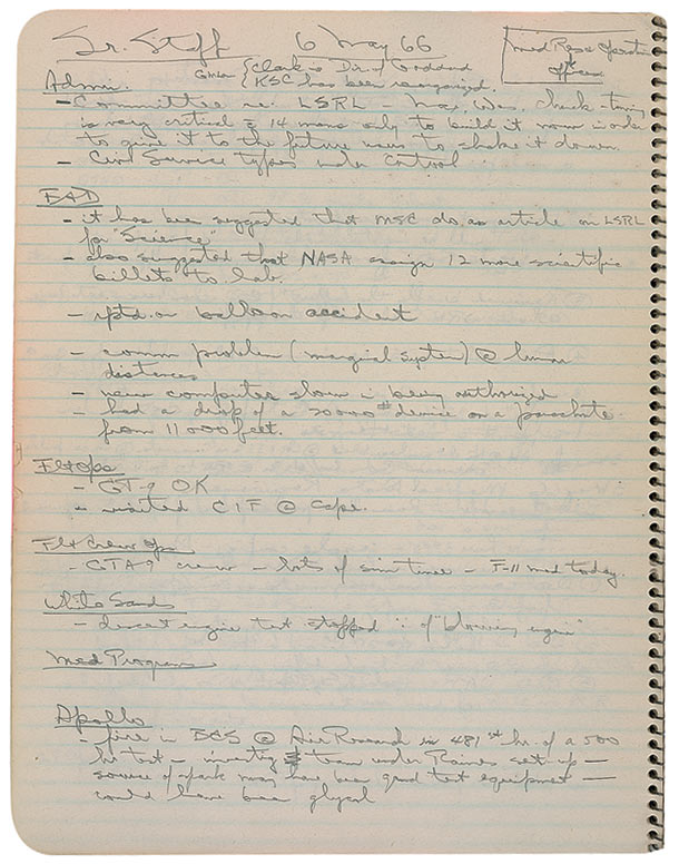 “Notebook #2” reads almost like a day-to-day diary of Coons’s daily work activities and very detailed meeting notes. Planning meetings for various Gemini missions are included, with mentions of many prominent names, including Armstrong, Aldrin, Collins, Young, Slayton, Shepard, Kerwin, See, Stafford, Scott, Kranz. A selection of entries follows: