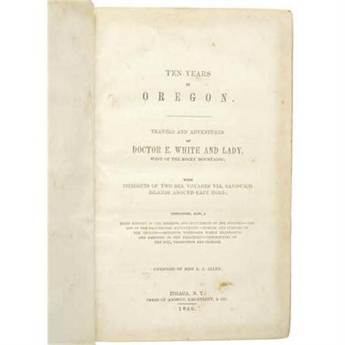 <B>Dr. E.White and Miss A. J. Allen, (compiler) Ten Years in Oregon. </B></I> <B>Travels and Adventures of Doctor E.White and Lady, West of the Rocky Mountains; With Incidents of Two Sea Voyages Via. Sandwich Islands Around Cape Horn; Containing Also a Brief History of the Missions and Settlement of the Country... </B></I>(Ithaca, New York: Andrus, Gaunlett & Co.,1850 1848 ), 430 pages, 8vo, 430 pages, full brown calf leather with spine label. Rubbed, corners worn, text clean with light foxing. Covers loose, else good.<BR>Dr. Elijah White, a Presbyterian missionary, went overland to Oregon in 1842 and returned in 1845 by sea. This edition includes 31 pages from Frémont's Narrative, which extended the text by 31 pages. (Howes A-131; Flake 50a; Graff 37; Wagner Camp, Becker 144:2; Decker-Soliday II 23; Mintz 8; Smith 115).<BR><BR><BR><b>Shipping:</b> Books & Catalogs (<a target="_blank" href="http://www.heritageauctions.com/common/shipping.php">view shipping information</a>)