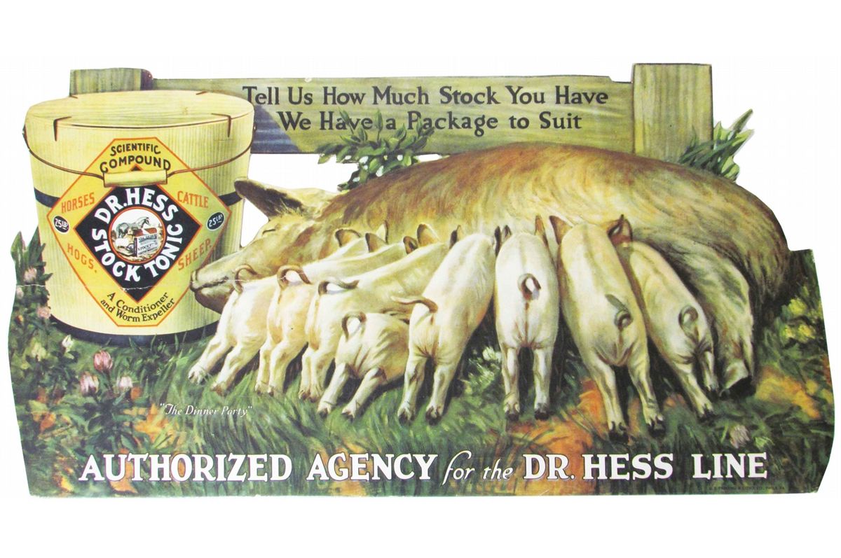 Dr. Hess Stock Tonic Die Cut Cardboard Sign. Depicting piglets having dinner. U.S. Printing and Litho Company, Philadelphia. Crease at 9:00 otherwise excellent condition. 27 X 14 inches.