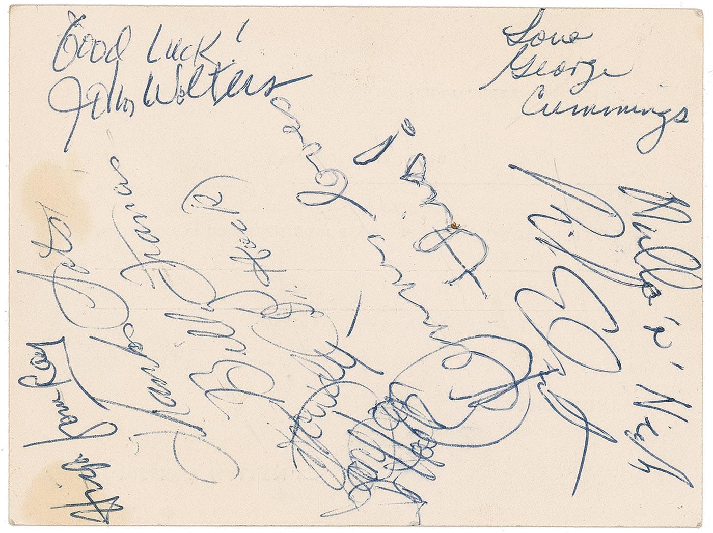 German-language ticket signed in blue ballpoint on the reverse by seven Dr. Hook and the Medicine Show. Signers are: Billy Francis (adding “Dr. Hook”), George Cummings, John Wolters, Ray Sawyer (signing “High from Ray”), Bob Henke, Dennis Locorriere (signing “Dennis loves this!”), and Rik Elswit. In fine condition, with two areas of soiling touching the first part of Sawyer’s sentiment and the end of Francis’ sentiment and faint edge toning.