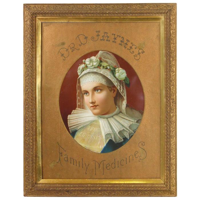 Dr. Jayne's Family Medicines stone litho on cdbd in orig frame, VG cond w/some restoration on gold m