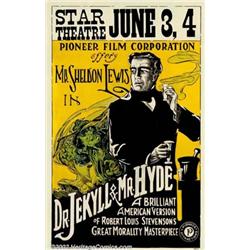 Dr.Jekyll and Mr. Hyde (Pioneer Film Corp. 1920). Window Card (14" X 22"). The same year that Paramount released its version of the famous Robert Louis Stevenson story starring John Barrymore, Pioneer Film released a smaller budget adaptation starring Sheldon Lewis .In his long career, Lewis appeared in many silent films including "Orphans of the Storm" and "Taming of the Shrew" (1925). Director Charles Hayden based his film on the stage play, as it was performed by Richard Mansfield in 1887. Before the appearance of this window card, no known posters were believed to be extant from this film, other than a few lobby cards. This wonderful card is very reminiscent of Victorian-era woodcut prints. Within the smoke behind the Doctor's back lurks Hyde! Very Fine/Backed. Important notice: We expect to be auctioning lots at the rate of 200-250 per hour. Sometimes eBay Premier live bid software cannot keep up with that pace, so we strongly recommend that you place a realistic proxy bid now as insurance to avoid disappointment. Also please note that all Heritage/CAA lots purchased through eBay Premier carry a 20% Buyer's Premium.