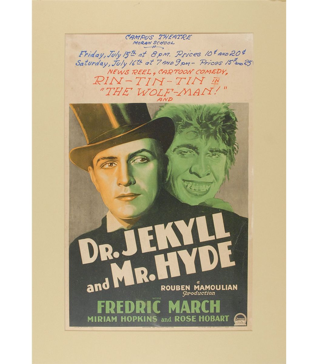 (Paramount, 1931) Exceedingly rare color 14 x 22 window card for the classic 1931 film Dr. Jekyll and Mr. Hyde, directed by Rouben Mamoulian and starring Fredric March. This is perhaps the most appealing poster created for the film, with a vibrantly colored image portraying the menacing duality of the title character. The upper imprint area is filled out in ink with information for the showing, reading: “Campus Theatre / Moran School / Friday, July 15th at 8pm. Prices 10¢ and 20¢ / Saturday, July 16th at 7 and 9 pm—Prices 15¢ and 25¢ / News Reel, Cartoon Comedy, / Rin-Tin-Tin in / ‘The Wolf-Man!’ and [Dr. Jekyll and Mr. Hyde].” The copyright notice in the lower border reads: “‘Country of Origin U.S.A.’ Copyrighted 1931—Paramount Publix Corp. This poster leased from Paramount Publix Corp.” Matted to an overall size of 18.75 x 26.75, with a mat opening of 13.75 x 21.75. In very fine condition. This film is still considered one of the best versions of the oft-adapted Robert Louis Stevenson tale of the man whose potion turns him from a mild-mannered man of science into a homicidal maniac. Frederic March’s terrific performance garnered immense critical acclaim, and for this role he earned his first Academy Award. A paramount piece from the horror genre.