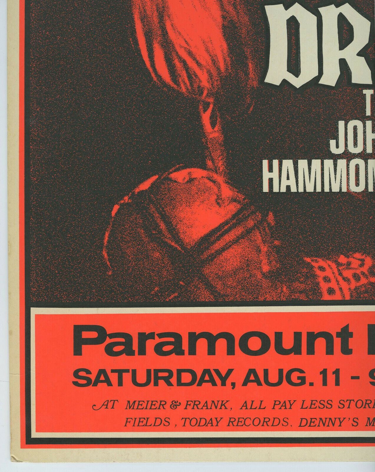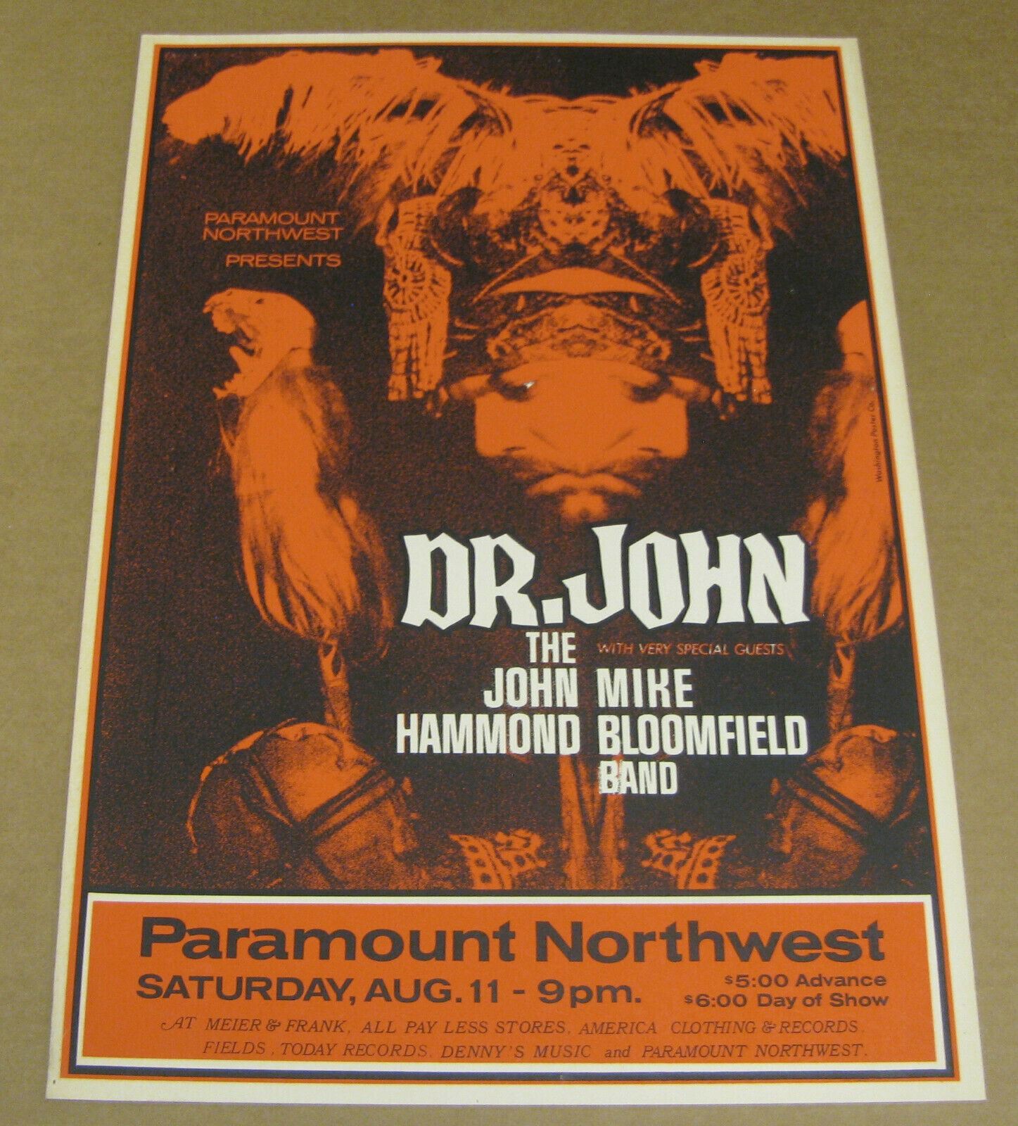 This is an original authentic cardboard boxing style concert poster advertising: DR. JOHN with The John Hammond/ Mike Bloomfield Band appearing August 11, 1973 at the Paramount Northwest Theatre in Portland, Oregon.