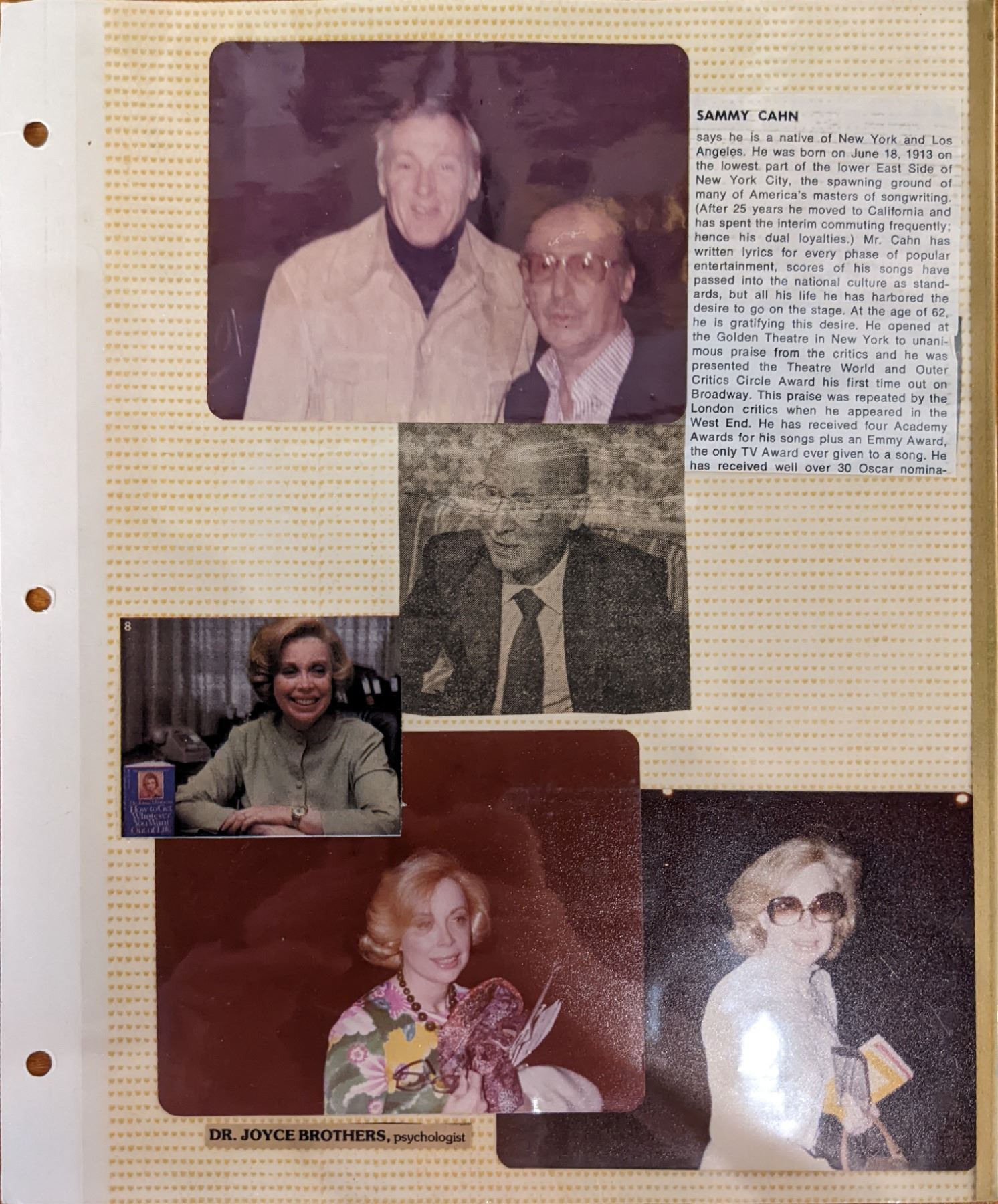 Dr. Joyce Brothers and Sammy Cahn Original Photos. From backstage at the Merv Griffin Show. 1980's. 4x4 inches. All of these pictures were taken backstage and are one of a kind photos with no copies made