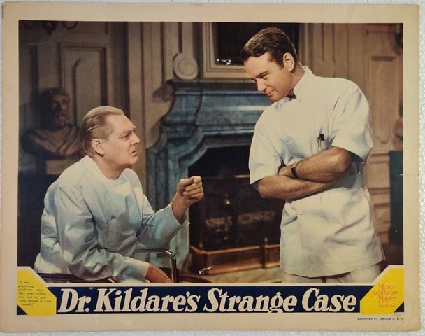 Dr. Kildare's Strange Case (Loew's, Metro-Goldwyn-Mayer [MGM], 1940). Medical, Drama. Starring Lew Ayres, Lionel Barrymore, Laraine Day, Shepperd Strudwick, Samuel S. Hinds, Emma Dunn. Directed by Harold S. Bucquet. Light edge wear, light creases, small tears, pin-holes, very light paper loss. Very Fine. (11"x14").