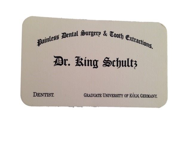 Dr. King Schultz (Christoph Waltz) "Painless Dental Surgery & Tooth Extractions" business card. (approx. 3 3/4" x 2 1/4")