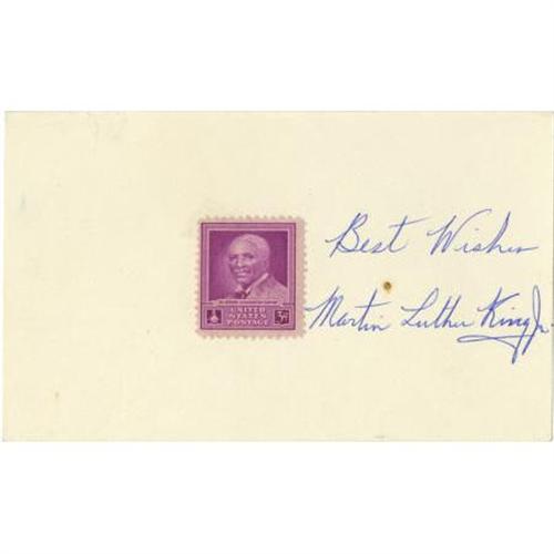 <B>Dr. Martin Luther King, Jr. Signed Card,</B></I> 5” x 3”, affixed with George Washington Carver commemorative stamp. Accompanying the autograph is a Typed Letter Signed, “<I>D. McDonald</B></I>”, one page on Southern Christian Leadership Conference letterhead, 8” x 10”, Atlanta, Georgia, March 29, 1969, to Michael J. Gerstley, Park Forest, Illinois. It reads: “<I>Dr. King asked me to send you the enclosed card which he has just autographed for your collection.</B></I>” The card is in excellent condition, whereas the letter has binding perforations and smoothed folds. Altogether as excellent package prepared at the height of Dr. King's civil rights career.<BR><BR><b>Shipping:</b> Flat Material, Small (<a target="_blank" href="http://www.heritageauctions.com/common/shipping.php">view shipping information</a>)