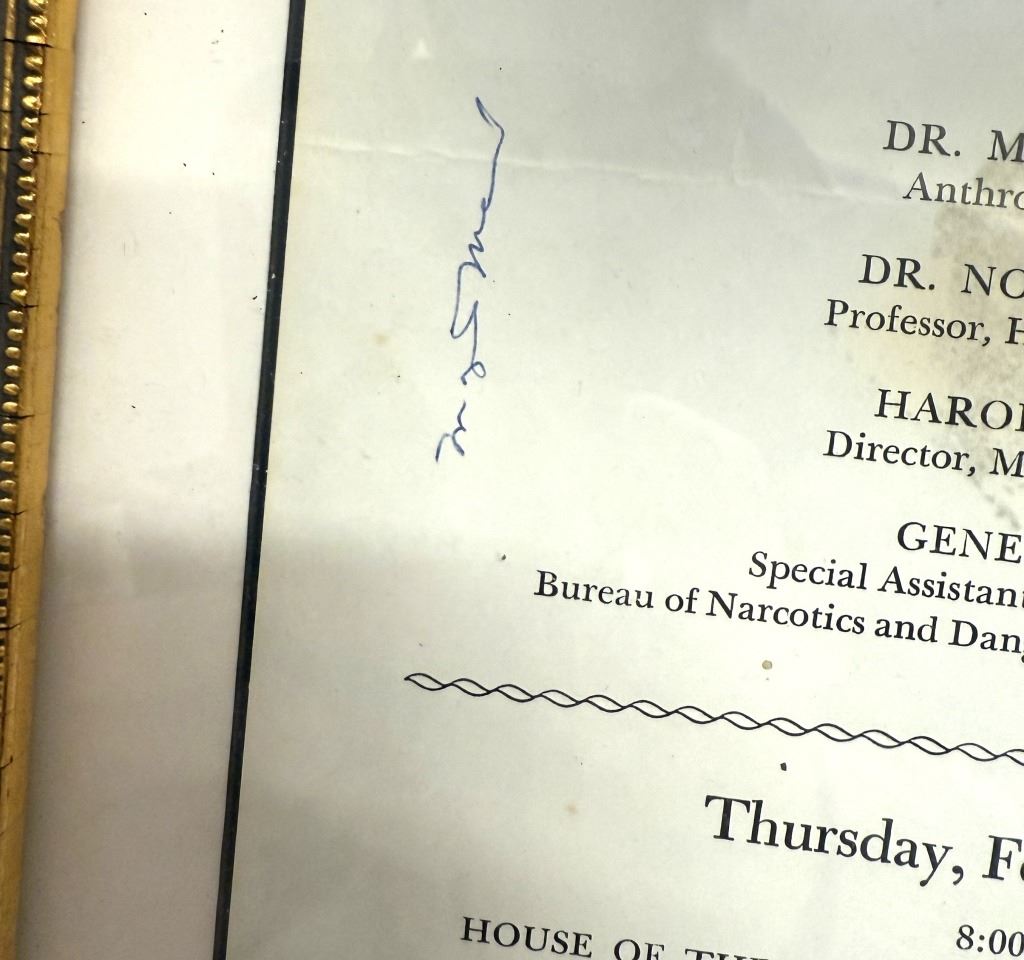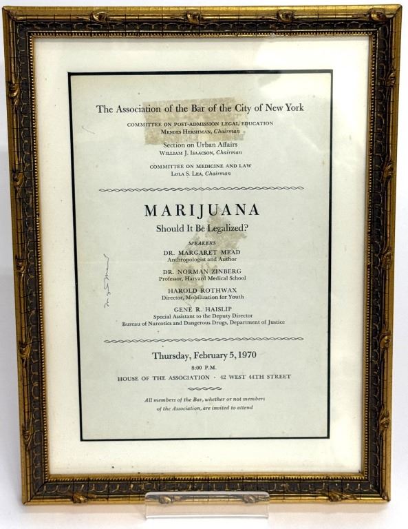 Item/Description: The Association of the Bar of the City of New York 1970 lecture announcement, featuring several well-known figures in medicine, anthropology, and law to debate the legalization of marijuana. Signed by one of the speaker's Anthropologist and Author, Dr. Margaret Mead. Other speakers include Professor, Harvard Medical School, Dr. Norman Zinberg, Director, Mobilization for Youth, Harold Rothwax, and Special Assistant to the Deputy Director, Bureau of Narcotics and Dangerous Drugs, Department of Justice, Gene R. Haislip.