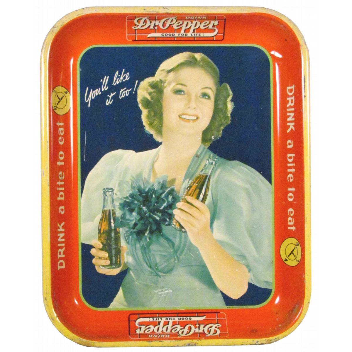 Dr. Pepper 10-2-4 Tin Serving Tray. Depicting girl in green dress. Some surface scratches otherwise very good condition. 10 1/2 X 13 1/4 inches.