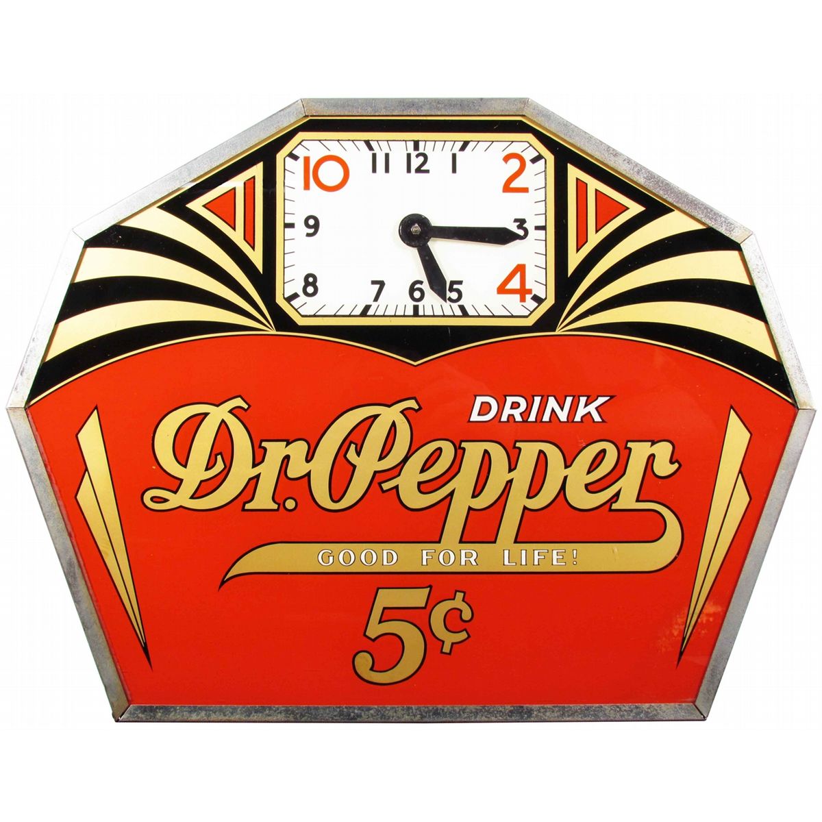 Dr. Pepper Deco Style Clock. "Good for Life" 5 Cents. Slight discoloration bottom right otherwise excellent condition. 22 X 17 inches.