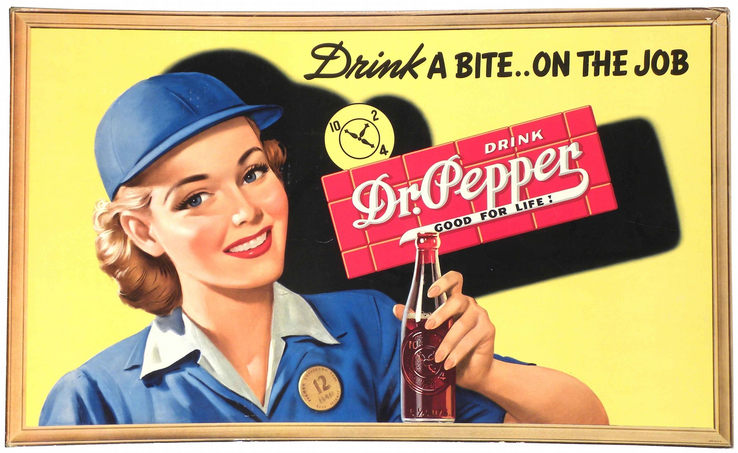 Dr. Pepper Self Framed Cardboard Sign. Entitled, "Drink a Bite on the Job". Some very minor edge ware otherwise excellent condition. 31 1/2 X 19 inches.