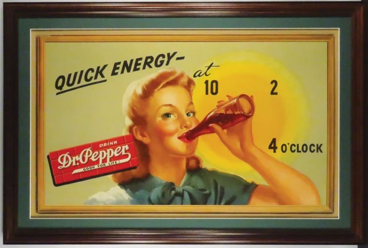 Dr. Pepper Self Framed Cardboard Sign. "Quick energy at 10-2-4 o'clock". Minor rub at top left perimeter otherwise excellent condition. 31 1/2 X 19 inches.