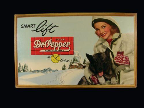 Dr. Pepper Self Framed Cardboard Sign, girl and dog with log cabin in winter. Mint condition. 31 1/2 X 19 1/4 inches.