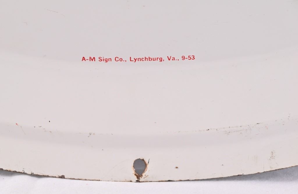 "10-2-4" Manufactured by A-M Sign Co. Lynchburg, Virginia. Dated 9-53. Measures 36" diameter.