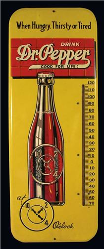 Dr. Pepper tin thermometer. Some red paint around edges otherwise very good condition. 10 X 25 1/2 inches.